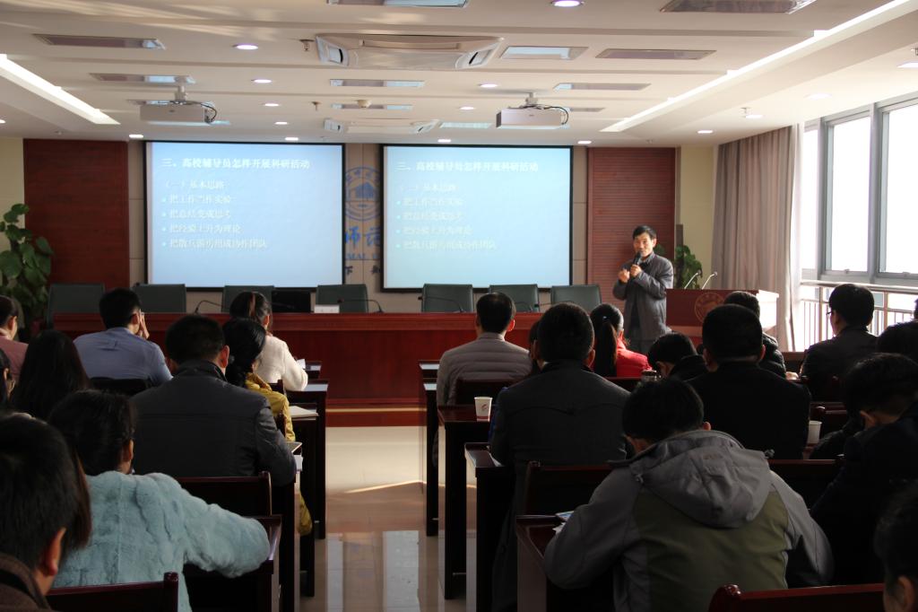 为了促进我校辅导员队伍专业化、职业化、专家化发展,鼓励辅导员从事学生工作相关理论研究,努力提高思想政治素质和业务能力,学生工作处、辅导员协会邀请原教育部高校辅导员培训和研修基地(安徽师范大学)专家、安徽师范大学博士生导师朱平教授来校作《高校辅导员的科研能力是怎样炼成的?》主题讲座。学生工作处处长马平,各学院党总支副书记以及全体辅导员聆听了讲座。