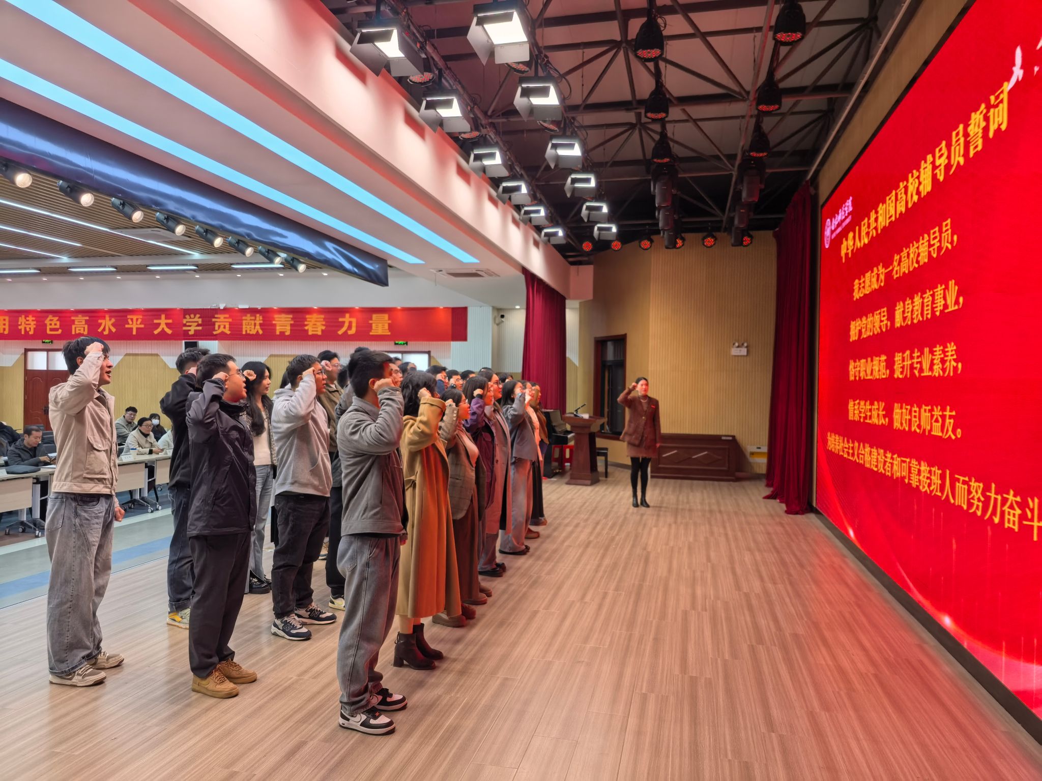 在与会人员的共同见证下,2025年新入职辅导员集体郑重宣誓。(辅导员协会:夏芳)