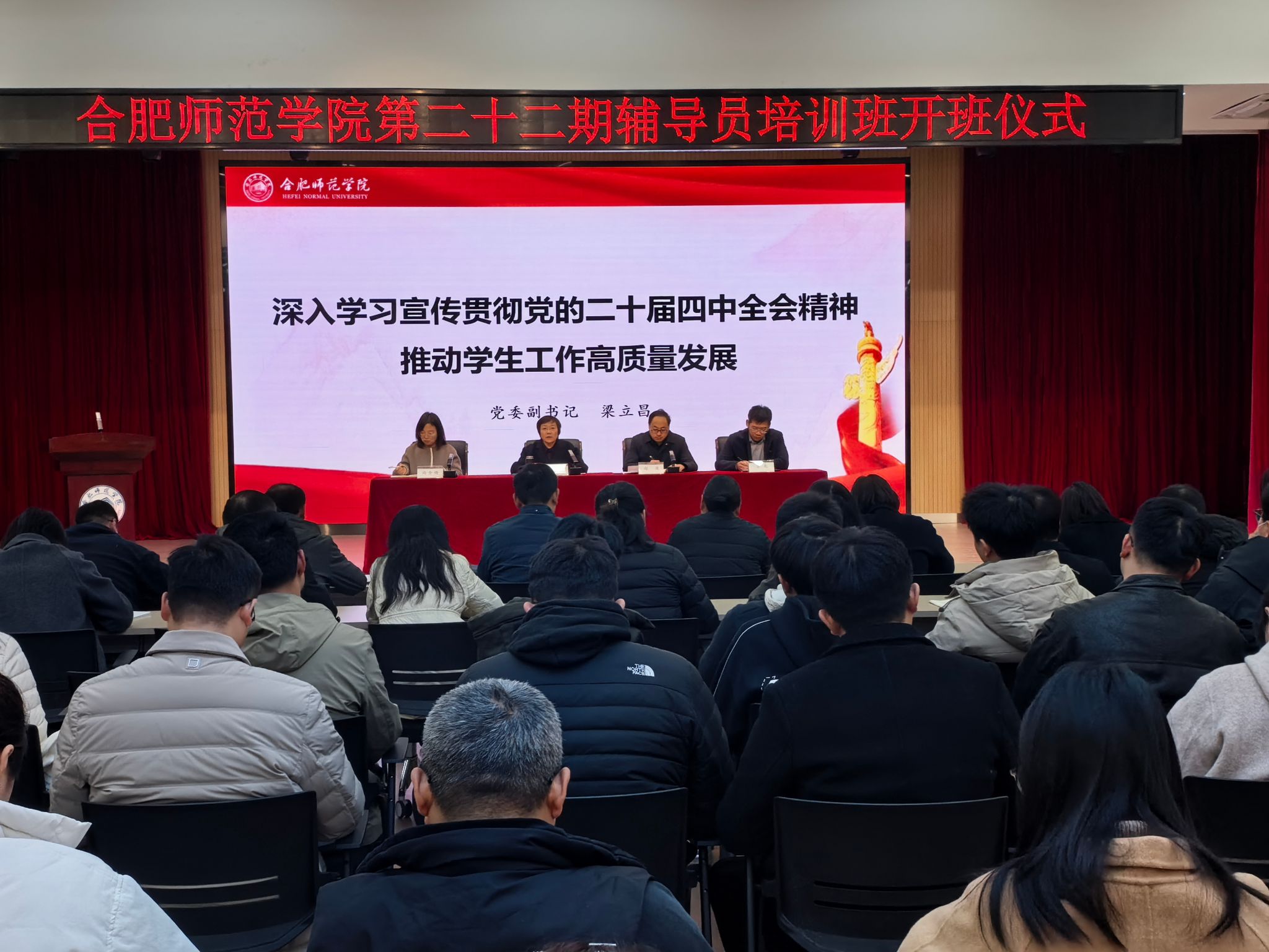 11月28日上午,学院在锦绣校区大学生活动中心举办第二十二期辅导员培训班开班式暨首场理论政策宣讲。院党委副书记梁立昌出席会议并讲话,学生工作部部长赵波、副部长尚金梅、各二级学院党委副书记及全体辅导员参加会议。