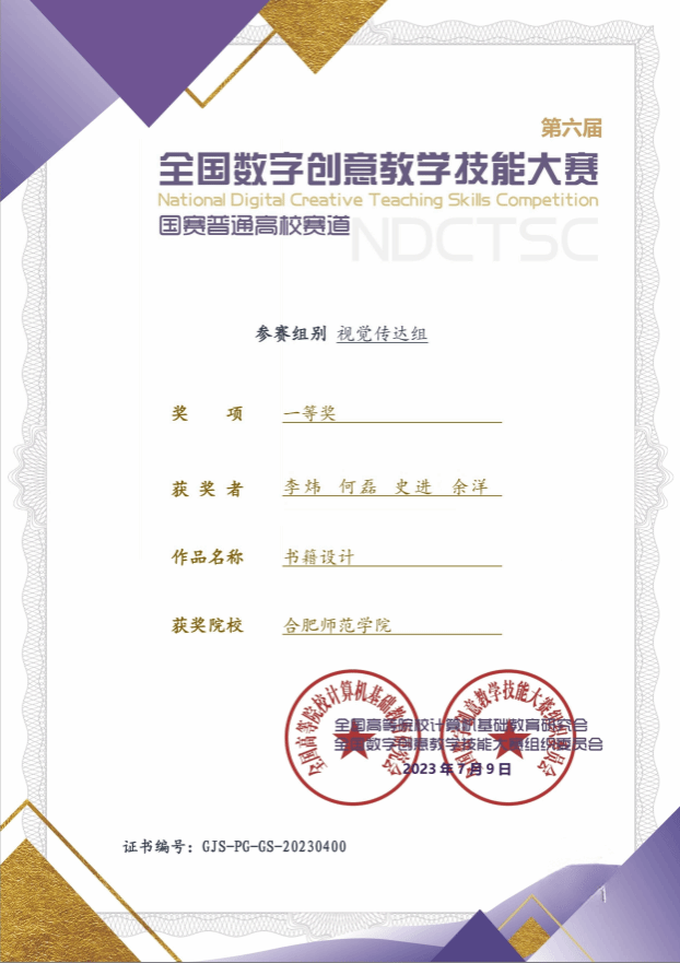本网讯 7月初,第六届全国数字创意教学技能大赛颁奖仪式在青岛世博华创国际产教融合园举行,我院李炜、何磊、史进、余洋教师团队参赛的课程《书籍设计》获全国一等奖。该团队精研优化课程内容,践行“以学生为中心”的教育理念,围绕学生的实践能力进行教学创新改革。通过建立知识、素养、能力、品德一体化的课程内容结构、打造数字化场景的学习氛围,重在提升课堂真实应用性,促进学生全面成长。该成果得益于近年来我校持续推进教育教学模式改革与创新的举措。