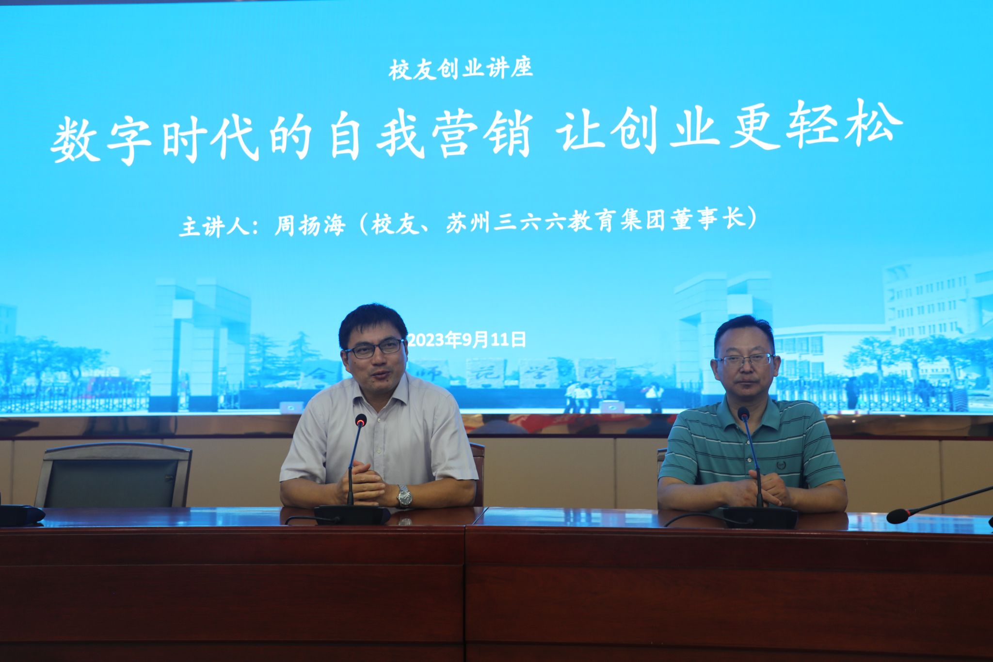 讲座中,周扬海以《数字时代的自我营销让创业更轻松》为题,围绕“创业的艰辛与快乐”“创业者需要具备的条件”“创业目标的确立”等方面,分享了自己十五年来的创业历程,梳理了数字时代大学生创业的机遇与挑战,分析了当前大学生创业现状和常见问题困难等,传授了如何充分利用新媒体开展商业运营、自我营销以及打造个人IP等经验,希望同学们学会做时间的朋友、找到适合自己的创业领域,在创业实践中要有自己的判断和果敢,并表示将与学院合作,为同学们创业提供资金与技术支持,真诚地欢迎大家毕业后到三六六教育集团就职。