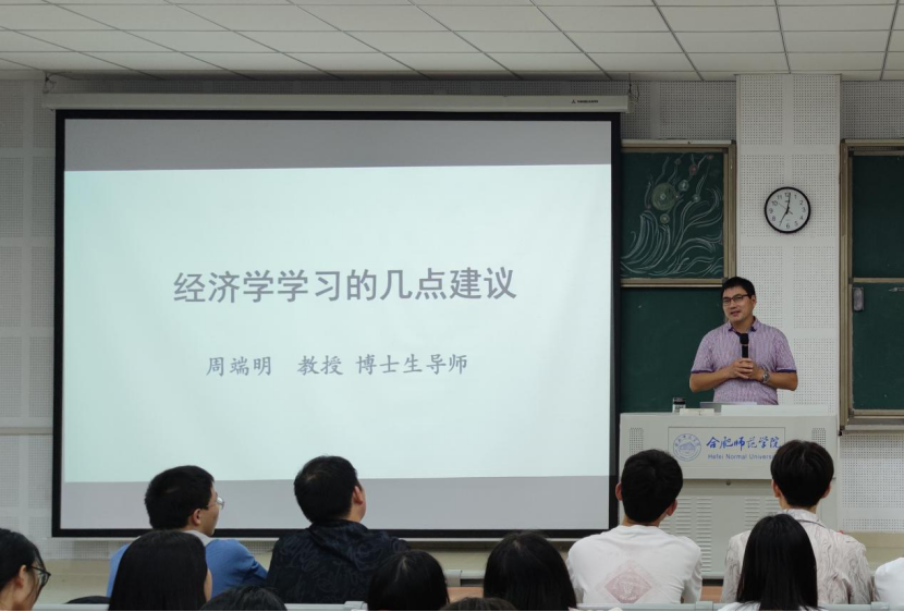 本网讯 为帮助新生更深入地了解经济学专业,更加主动地把握未来学习方向,9月14日晚,院党委委员、副院长周端明教授给经济与管理学院学生作了“经济学学习的几点建议”专题报告。经济与管理学院党政负责同志、辅导员及2023级普通本科新生200余人聆听了本次报告。