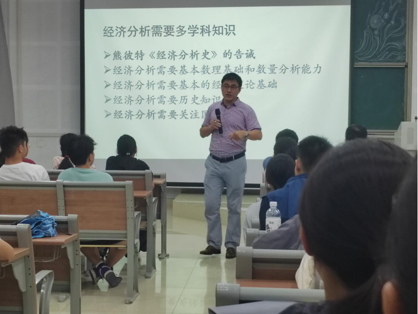 报告开始,周端明亲切地和同学们分享了他的求学经历。随后,周端明从“经济学是一门致用之学”、“经济分析需要更多学科知识”和“学好经济学意味着能够更深入理解经济社会”三个方面向同学们讲解了经济学专业内容,通过举例分析不同时代的经济现状,解释政府在如何控制社会总需求供给方面促进国家经济的发展。同时给同学们推荐经典经济学著作,如亚当斯密《国民财富的性质与原因研究》、马克思《资本论》第一卷、《经济学原理》和凯恩斯《就业、利息和货币通论》,帮助同学们更好了解经济学原理与知识。