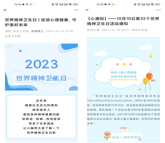 2023年10月10日是第32个“世界精神卫生日”,主题为“促进儿童心理健康,共同守护美好未来”。为增强我院学生心理健康意识,提升学生精神卫生水平,营造良好心理健康氛围,学院于10月9日至13日在全院范围内开展了世界精神卫生日宣传活动。