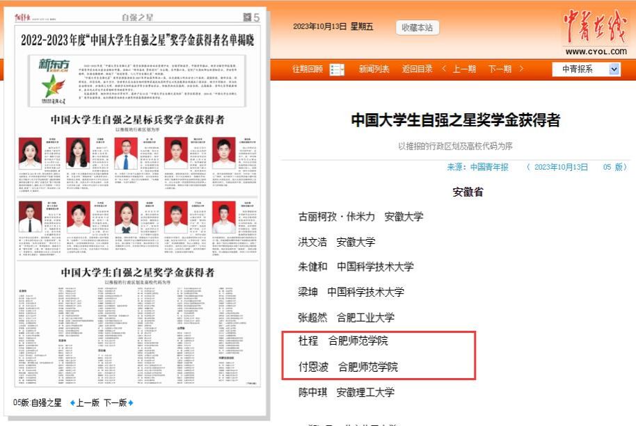 10月13日,2022年度“中国大学生自强之星”奖学金获得者名单正式揭晓,我院文学院付恩波、杜程同学获评“中国大学生自强之星”荣誉称号。