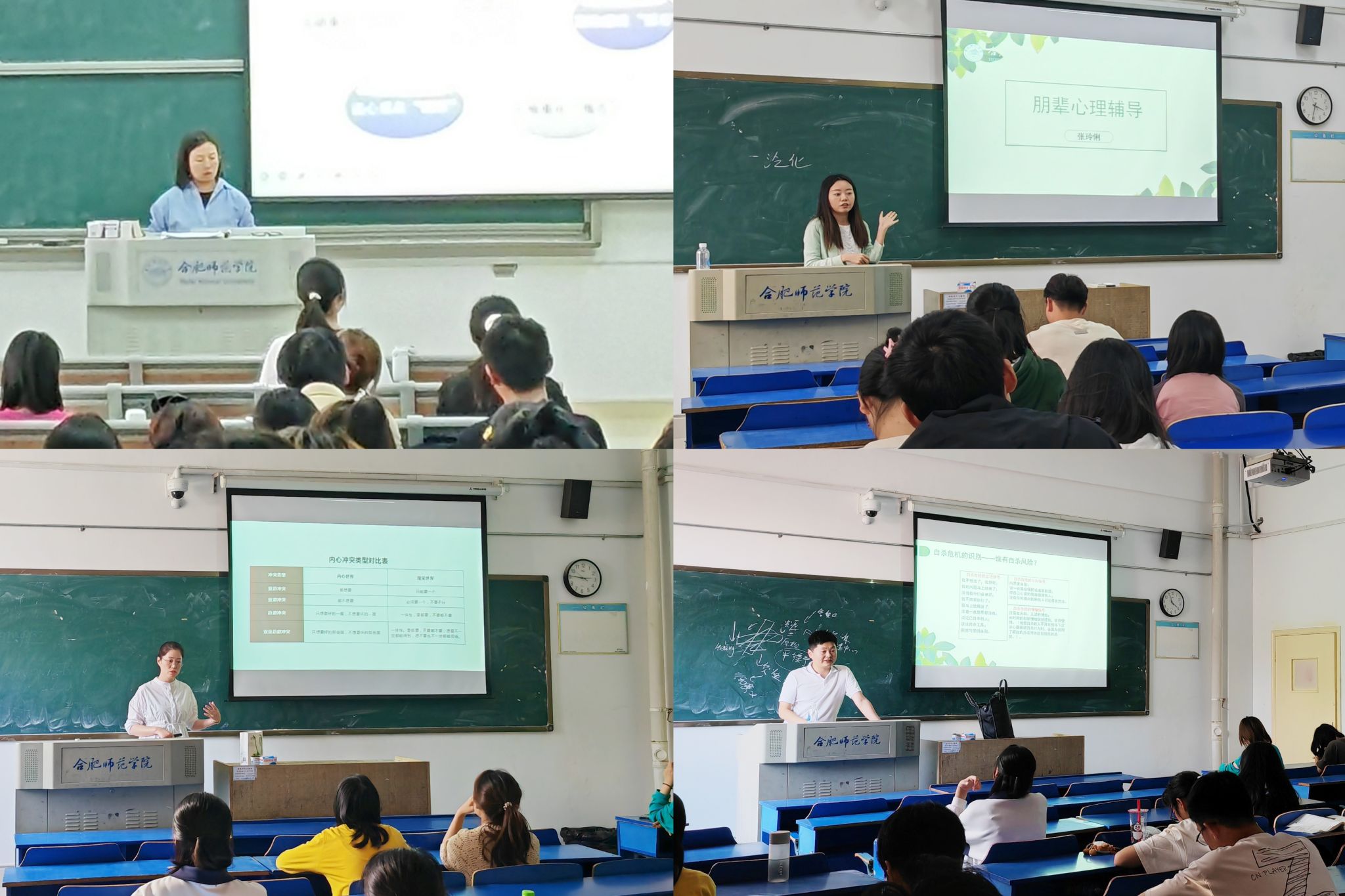 线下基础知识培训分4个专题共8场讲座,同步对滨湖、锦绣校区2023级班级心理委员进行培训。第一专题为“心理委员的工作职责与角色定位”,由学生工作处副处长尚金梅老师主讲。尚金梅强调了班级设立心理委员的重要性,详细讲解了班级心理委员带的角色定位和工作职责,重点介绍了心理委员作为非专业人员在学校四级心理健康网络中发挥作用。第二专题为“朋辈心理辅导”,由安徽省学生心理健康教育指导和发展中心张伶俐老师主讲。张玲俐详细讲解了朋辈心理辅导员应具备的素质,包括“七心六戒”和“工作三态度”等;重点介绍了朋辈心理辅导需要具备的基本技巧,特别倾听、探问、自我表露等技术在朋辈心理辅导中的应用。第三专题为“大学生常见心理问题的识别与对策”,由心理健康教育中心李晶晶老师主讲。李晶晶从高校工作案例出发,对大学生常见的心理问题进行了具体的分析,针对心理问题的具体表现,为班级心理委员后续工作提供了科学合理的建议和对策。第四专题为“大学生心理危机的预防与干预”,由心理健康教育中心韦小龙老师主讲。韦小龙从学校心理测评的数据引出当前学院学生的心理现状,详细讲解了心理危机的概念、“三”个标准、如何识别危机对象和心理委员在学院危机干预的作用等内容,介绍了心理危机应对可以用到的资源。