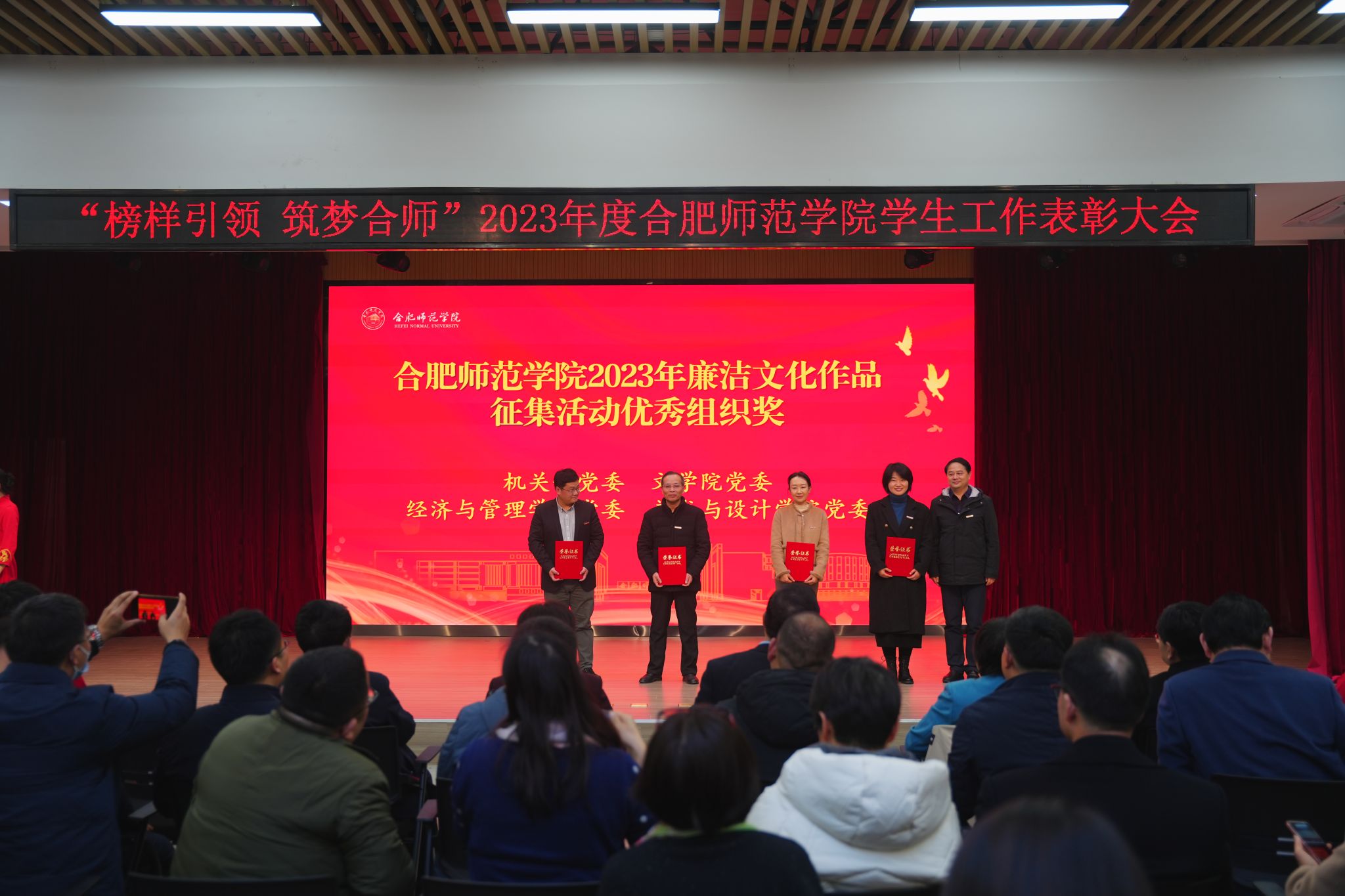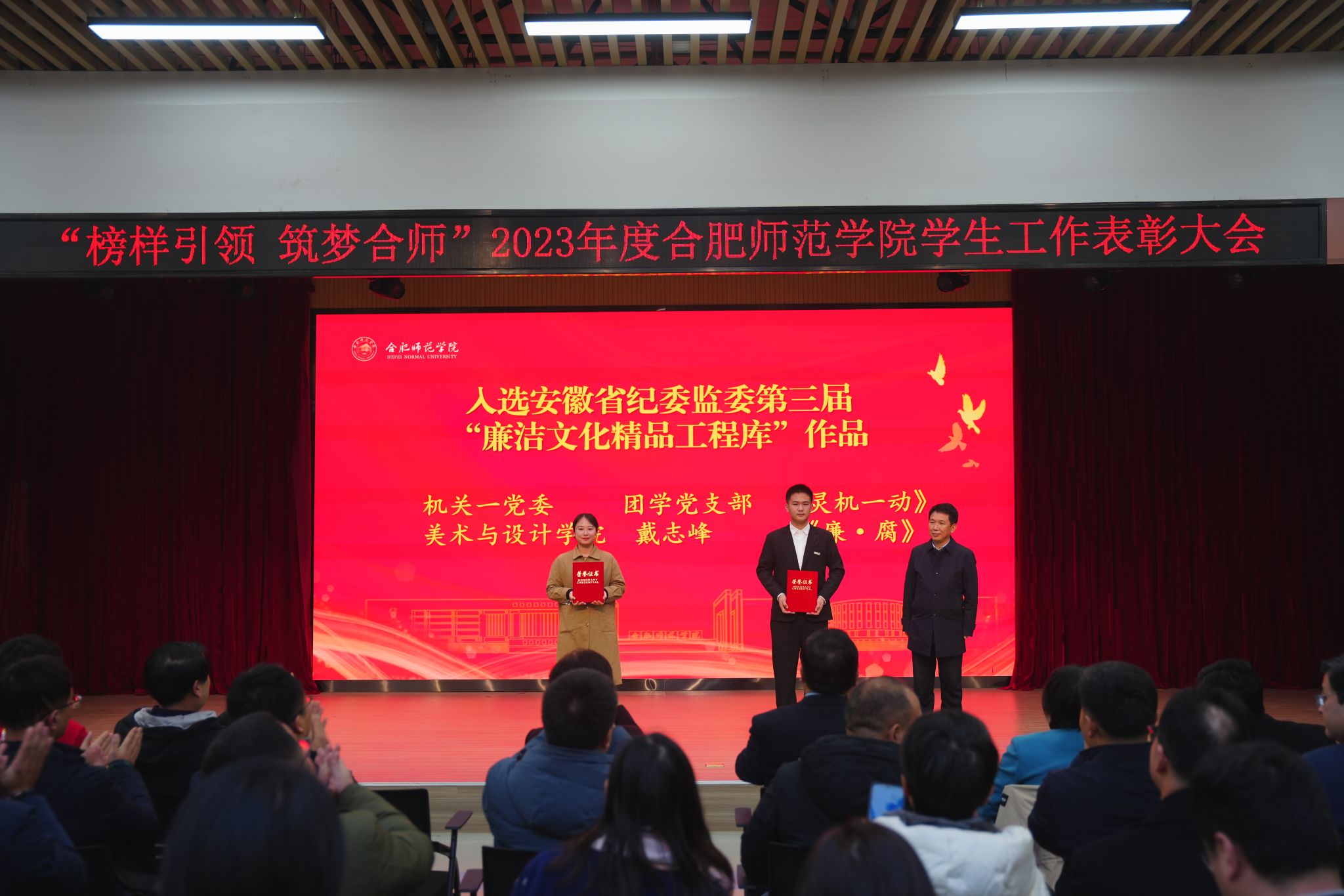 徐成钢为第三十一届世界大学生运动会奖牌获得者颁奖,方东玲为第十九届亚洲运动会奖牌获得者颁奖,梁立昌为2023年度安徽省辅导员年度人物、安徽省大学生年度人物获奖者及国家奖学金、国家励志奖学金获奖者代表颁奖,徐文林为入选安徽省纪委监委第三届“廉洁文化精品工程库”作品创作者颁奖,赵帮恚为学院2022年度优秀辅导员颁奖,常树宝为学院2023年廉洁文化作品征集活动优秀组织奖颁奖。现场还为学院2023年度廉洁文化作品征集活动获奖师生,2023年度十佳优良学风班级、十佳优良学风宿舍、十佳优良学风个人,第二十八届大学生科技文化艺术节优秀组织奖、组织奖和“十佳活动”进行了颁奖。