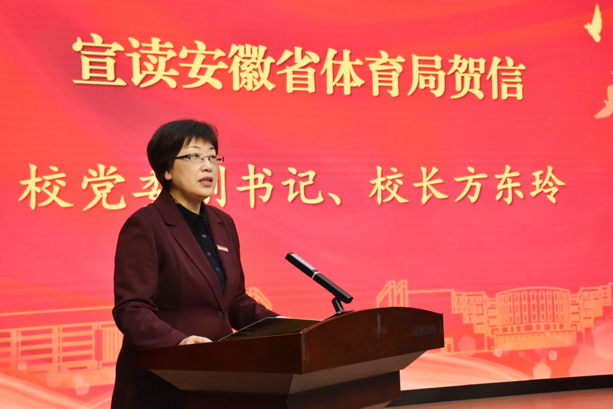 方东玲宣读了安徽省体育局就beat365唯一官方网站学子在成都第三十一届世界大学生夏季运动会和杭州第十九届亚洲运动会上摘金夺银、为国争光,取得优异成绩所发来的贺信。