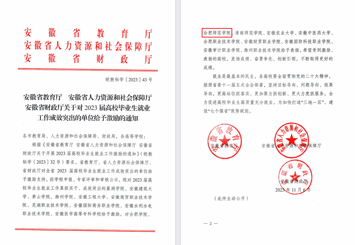 近日,安徽省教育厅、安徽省人力资源和社会保障厅、安徽省财政厅联合下发了《关于对2023年度高校毕业生就业工作成效突出的单位给予激励的通知》,我校获通报表扬,这是学院继2022年就业工作成效突出获激励以来再次获得表彰。