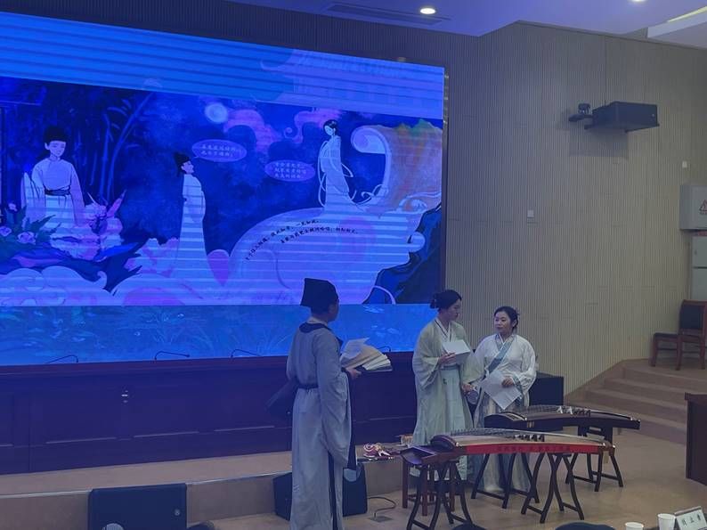 首先向大家呈现的是合肥本土故事《赤阑桥》,音乐学院江楠团队表演了《赤阑桥畔》,青轻读书会成员、来自包河区金斗路小学乔冰冰和王翠老师带来了散文朗诵《赤阑桥情结与词人姜夔的从军》。我校钱立青教授根据庐州民间传说创作了同名剧本《赤阑桥》。作品以南宋著名词人姜夔与赤阑桥畔琵琶女的知音情缘为线索,演绎出了人民大众奋起抗争外族入侵、誓死保卫家园的一段凄美的故事。《赤阑桥》已经成为合肥城市的一个文化标识。我院师生非常重视传统文化的传承与创新,组建了诸多团队开展研究与创作,编排并上演了话剧版《赤阑桥》,创作了动漫版《赤阑桥》,作品荣获了全省第七届大学生艺术展演的戏剧二等奖和设计二等奖。同时,学生以“合肥往事《赤阑桥》的原创绘本设计”入选2023全省大学生创新创业训练计划。通过《赤阑桥》,现场不少同学表示对“大湖名城”的合肥有了新认识,充分体现了挖掘区域文化资源的价值与意义。
