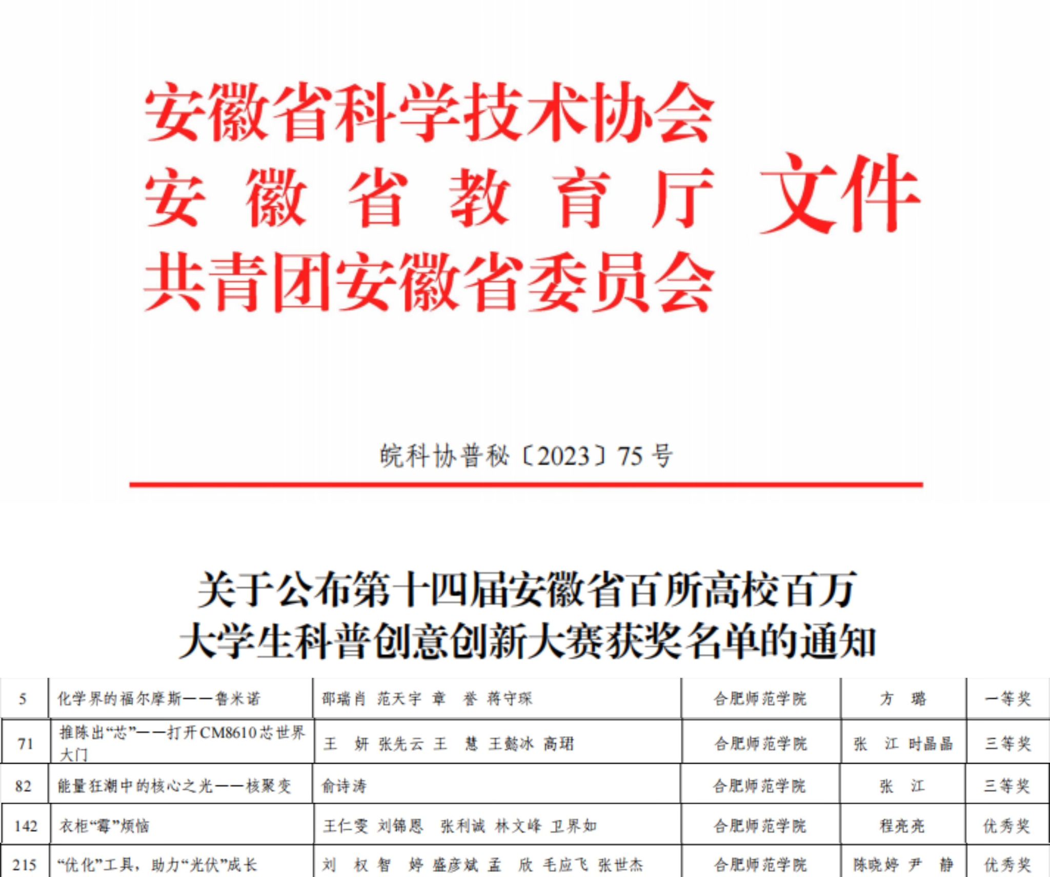 其中,化学与制药工程学院邵瑞肖、范天宇、章誉、蒋守琛的作品《化学界的福尔摩斯——鲁米诺》获一等奖;电子信息与集成电路学院王妍、高珺、张先云、王慧、王懿冰的作品《推陈出“芯”——打开CM8610芯世界大门》,计算机与人工智能学院俞诗涛的作品《能量狂潮中的核心之光——核聚变》获三等奖;电子信息与集成电路学院王仁雯、刘锦恩、张利诚、林文峰、卫界如的作品《衣柜“霉”烦恼》,电子信息与集成电路学院刘权、智婷、盛彦斌、孟欣、毛应飞、张世杰的作品《“优化”工具,助力“光伏”成长》获优秀奖。
