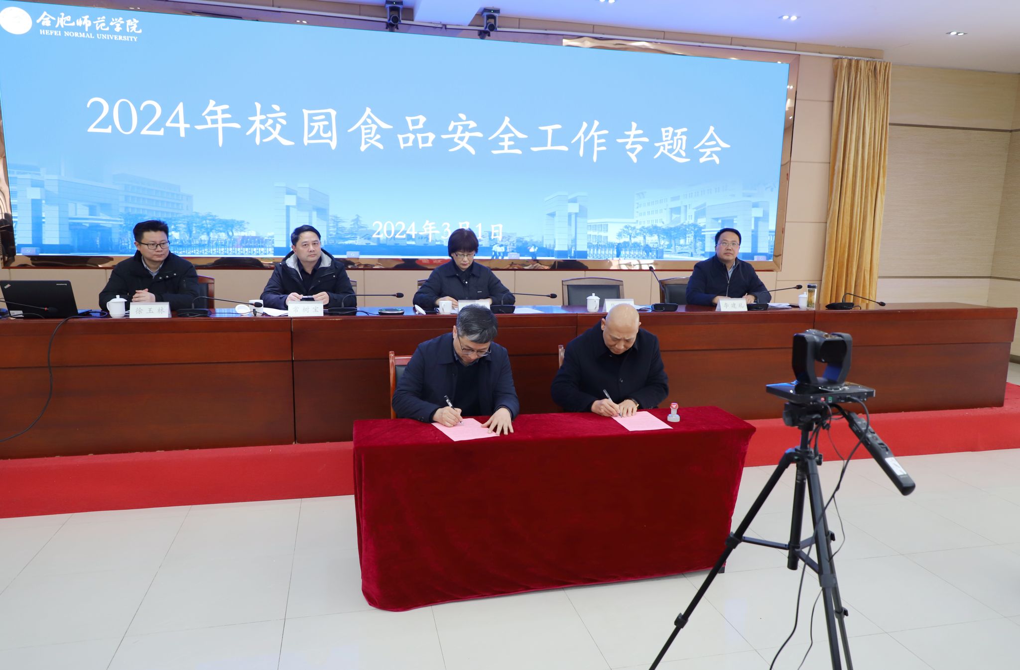 本次会议采用主-分会场形式,滨湖校区食品从业人员在滨湖校区学术报告厅观看视频直播。后勤处(基建办)负责人李建礼领学了《全省校园食品安全排查整治专项行动实施方案》《集中用餐单位食堂防鼠八项措施》等相关文件,对2023年校园食品安全工作简要回顾,并对2024年校园食品安全工作做出部署。