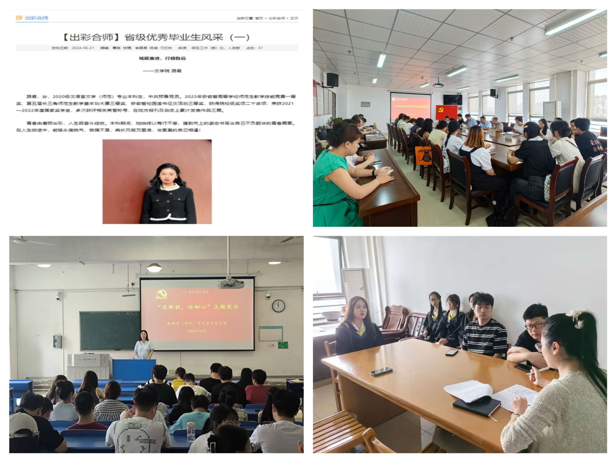 学院组织开展2024年优秀毕业生评选,358名同学获评校级“三好学生”、184名优秀学生干部、408名优秀毕业生,144名同学获评安徽省普通高等学校优秀毕业生,编发“出彩合师”毕业生风采展,充分发挥朋辈榜样示范引领作用。各二级学院通过经验座谈会、分享交流会,选树一批在学习、升学、就业、学科竞赛、科研创新等方面表现突出的同学,分享成长故事和经验感悟,激励低年级同学向榜样学习,营造了良好的校园学习成长氛围。