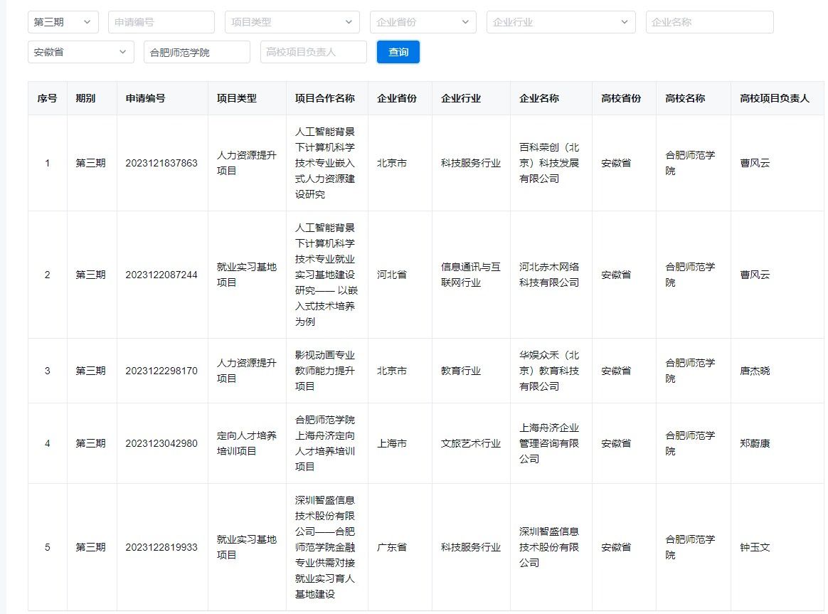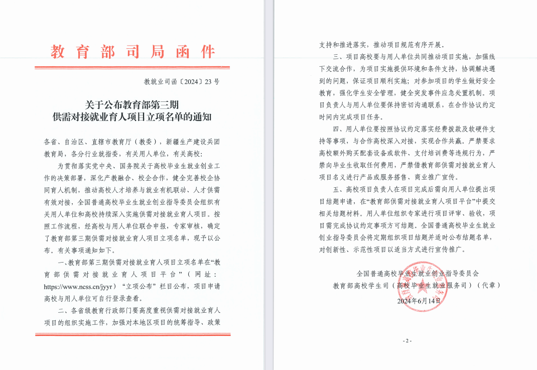 近日,教育部高校学生司(高校毕业生就业服务司)发布《关于公布教育部第三期供需对接就业育人项目立项名单的通知》(教就业司函〔2024〕23号),我院5个供需对接就业育人项目成功获批立项,涵盖就业实习基地项目2项,人力资源提升项目2项,定向人才培养培训项目1项。