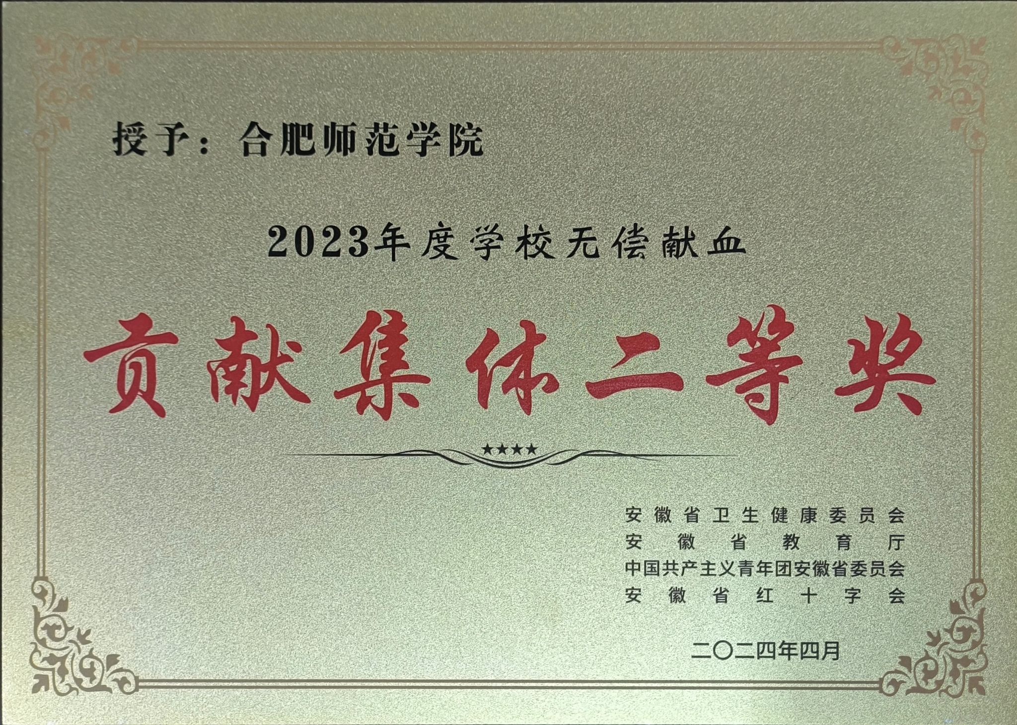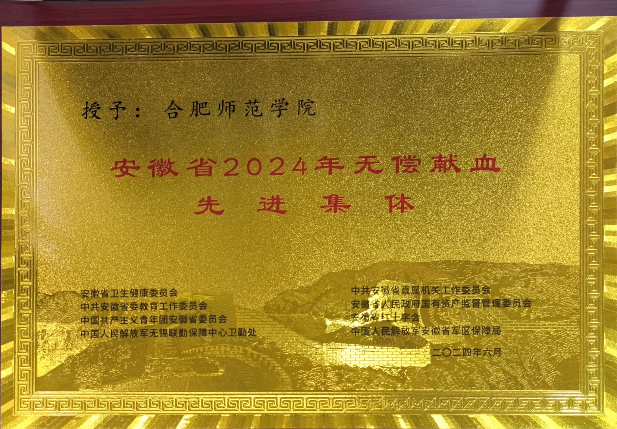 近日,由省卫健委、省直机关工委、省委教育工委、省国资委、团省委、团红十字会、解放军无锡联勤保障中心卫勤处、省军区保障局联合举办的2024年安徽省世界献血者日主题宣传庆祝活动在滁州市举办,我院荣获“安徽省2024年度无偿献血先进集体”称号。