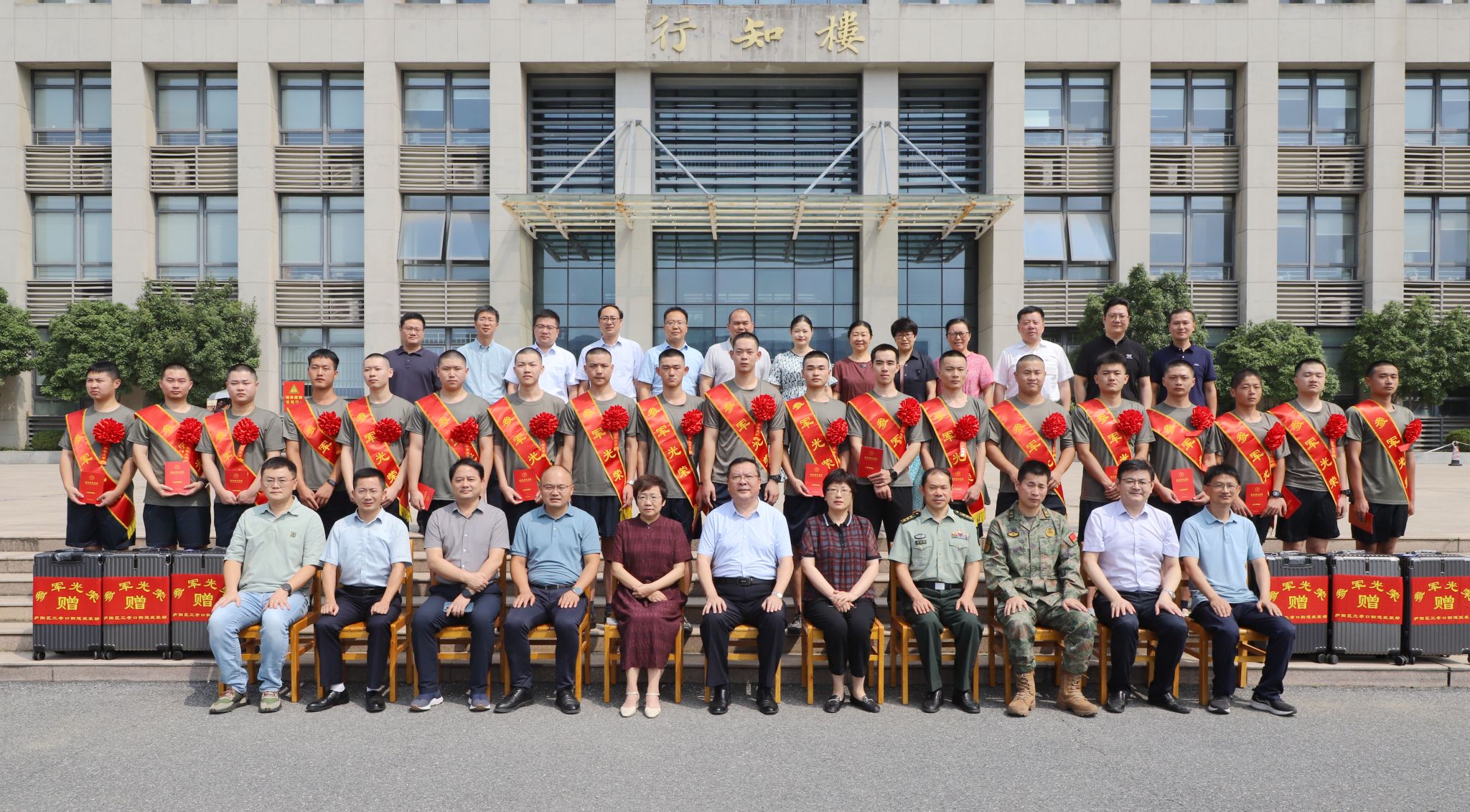 会后,参会领导与应征入伍毕业生在行知楼前合影留念。(学生工作部、人武部)