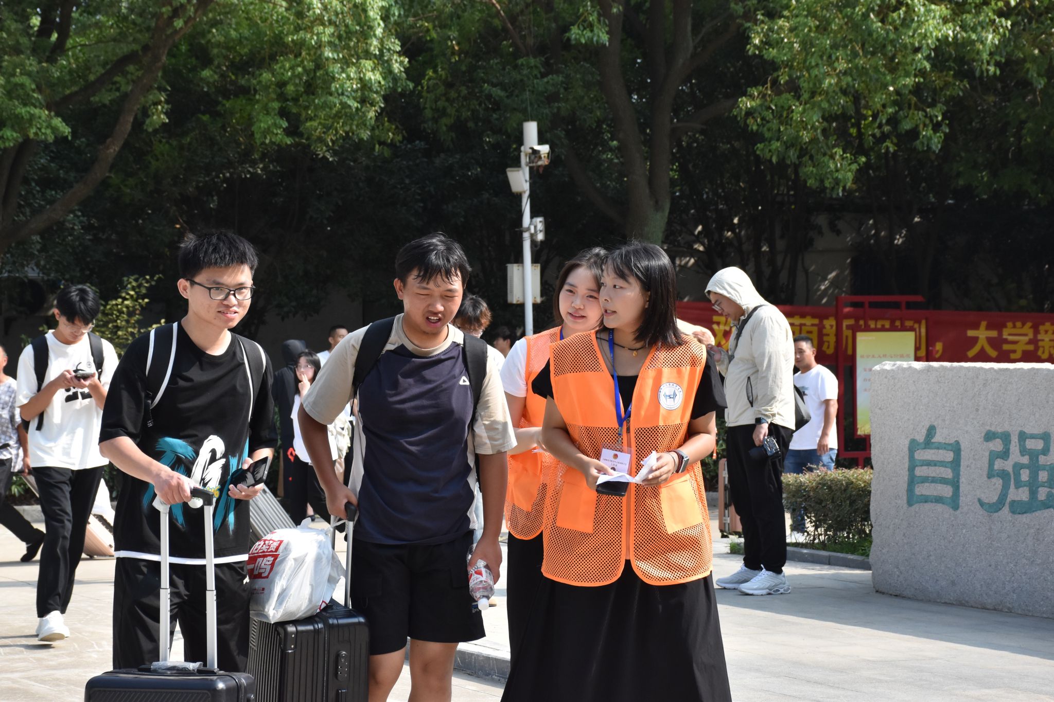 一路走来,志愿者们汗流浃背,但他们的脸上始终洋溢着灿烂的笑容,如同清凉的微风,吹散了夏日的炎热,也吹进了每一位新生的心田,他们用行动诠释了“奉献、友爱、互助、进步”的志愿精神和“爱满天下、知行合一”的校训精神。