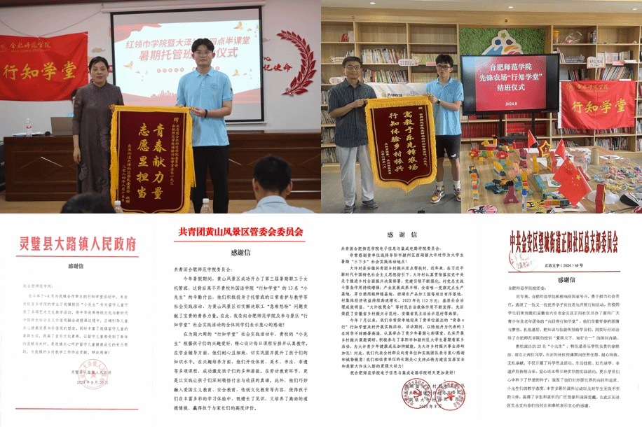 随着“行知学堂”实践活动知名度和影响力进一步扩大,吸引了东南大学、南京师范大学、安徽师范大学、安徽理工大学、安徽建筑大学、安徽中医药大学、安庆师范大学、常州大学、上海技术工程大学、广东医科大学等54名外校青年大学生主动参与建设学堂23个,服务农村留守儿童1500余人。学院先后收到宿州市埇桥区、灵璧县、滁州市琅琊区、合肥市庐阳区、肥东县、六安市金安区等地方基层政府、学员家长赠送数个锦旗和感谢信。