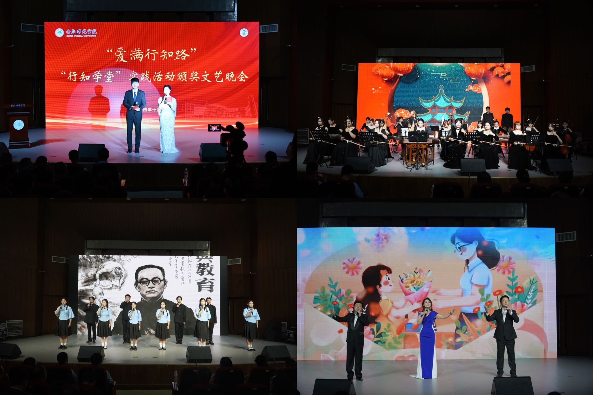 10月16日晚,“爱满行知路”行知学堂实践活动颁奖文艺晚会在锦绣校区音乐厅举行,中国陶行知研究会常务副会长陈洛,副会长吕德雄、陈华、童兆玲、童富勇、王仁雷、程晋升、卢志文,监事陈振华,中国陶行知研究会副会长、安徽省陶行知研究会会长、beat365唯一官方网站党委书记徐成钢,beat365唯一官方网站党委副书记、院长方东玲,党委副书记梁立昌,党委委员、纪委书记、监察专员徐文林,副院长华银峰,党委委员、组织部部长赵帮恚,党委委员、宣传部、统战部部长常树宝出席活动,中国陶行知研究会2024年学术年会与会代表、“行知学堂”实践活动先进典型获奖单位和个人、学院师生代表到场观看,晚会通过“合师青年”抖音官方号直播。