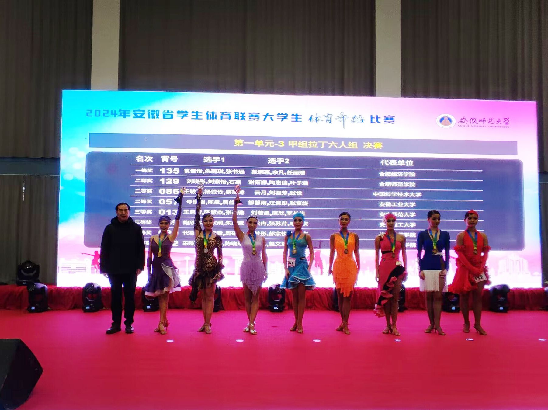 学院高度重视此次比赛,选派体育科学学院吴文博和梁爽老师分别担任甲组(非体育生组)和丙组(体育生组)教练,选拔教育与心理科学学院叶子涵、石嘉,经济与管理学院谢雨娜、美术与设计学院刘紫怡、电子信息与集成电路学院刘晓彤和物理与材料工程学院陶惠佳,体育科学学院段紫昱、孙梦琪、张彤、李月雯、赵婉妍、孙慧琴、李家欣、夏旋、焦可寻、汪厚传等16名学生代表学校参加甲组和丙组的比赛,本次比赛项目少,人数多,竞争异常激烈,我校学子不畏艰难,从预赛到半决赛再到决赛,在几十个代表队中层层突围,最终甲组获得拉丁团体六人组第二名,丙组获得拉丁团体六人组第三名和双人第六名的好成绩。