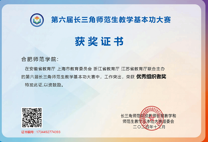 近日获悉,我校在2024年安徽省高等学校师范生教学技能竞赛、第六届长三角师范生教学基本功大赛和2024年安徽省本科师范院校教师智慧教学大赛中获优秀组织奖。