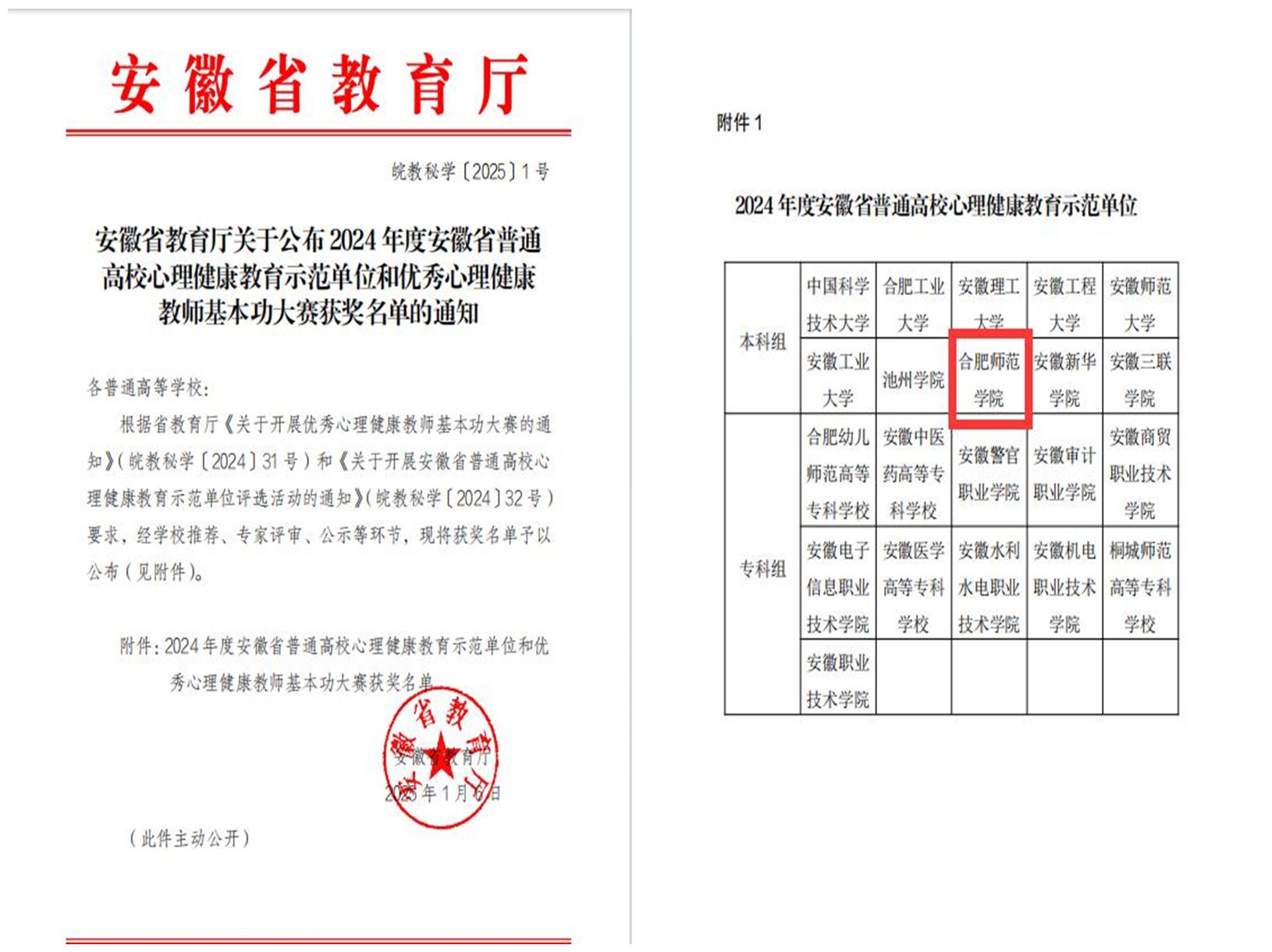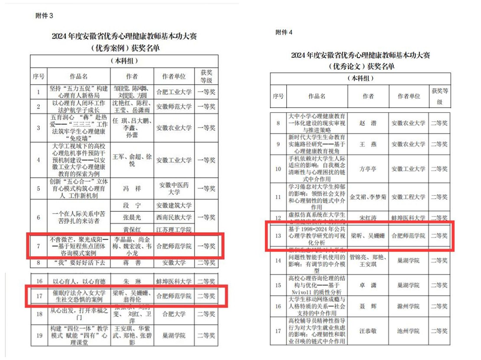 近日,安徽省教育厅公布2024年度安徽省普通高校心理健康教育示范单位和优秀心理健康教师基本功大赛评选结果,学院获评“2024年度安徽省普通高校心理健康教育示范单位”荣誉称号,学院教师李晶晶、梁昕等分别获心理健康教师基本功大赛优秀案例一等奖、二等奖,梁昕获心理健康教师基本功大赛优秀论文二等奖。