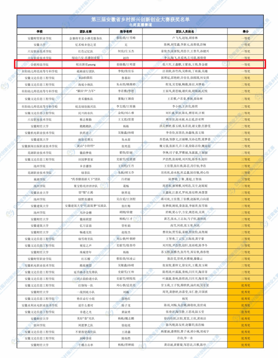 近日,由安徽省农业农村厅、安徽省教育厅、安徽省住房城乡建设厅、安徽省人力资源社会保障厅等共同主办的第三届安徽省乡村振兴创新创业大赛评选结果揭晓,我校文学院“皖”出新花Young团队斩获电商直播赛道一等奖。