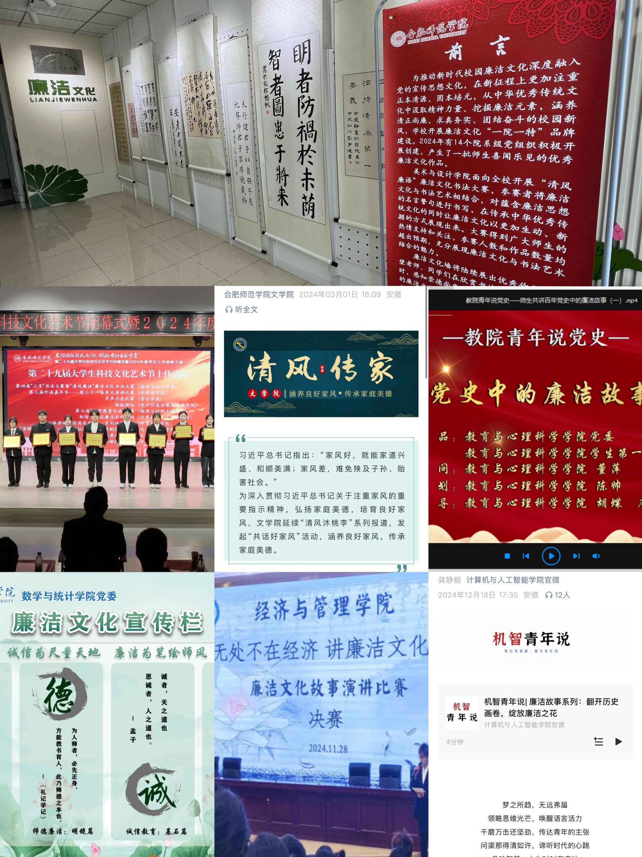 创建中,各二级学院注重挖掘自身特色,先后推出“廉洁故事·机智青年说”师生讲述革命先辈廉洁故事、“廉风频送”廉政微视频党课、廉洁文化书法大赛、“清风雅韵”高校廉洁文化歌曲创作、“诚信为尺量天地 廉洁为笔绘师风”廉洁文化宣传栏等一批主题鲜明的廉洁文化项目,利用学院官方微信、宣传栏、廉洁文化墙等载体宣传廉洁内容。讲好文化故事、擦亮廉洁品牌,廉洁文化呈现百花怒放态势,打造一批形式鲜活、特点鲜明的廉洁文化阵地载体,通过以廉促教、以廉育人,巩固深化党纪学习教育成果,为净化校园政治生态注入新鲜能量。