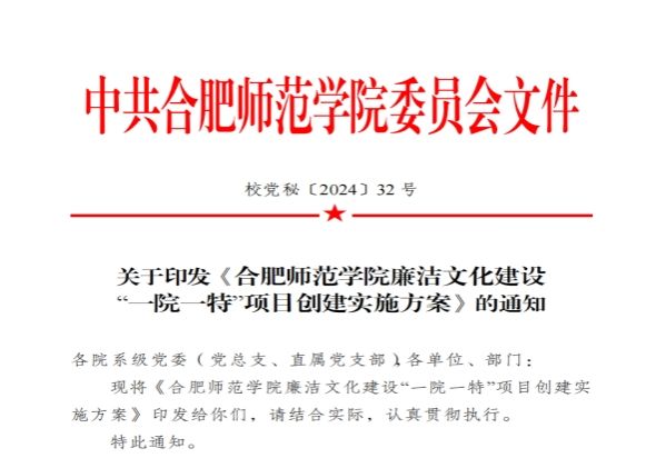 为深入贯彻落实习近平总书记关于加强新时代廉洁文化建设重要论述,推动廉洁文化深度融入高校党的宣传思想文化工作大局,培育具有合师校园文化特色的廉洁文化项目,2024年学院出台《廉洁文化建设“一院一特”项目创建实施方案》,积极推动14个二级学院结合学科专业特点、传统文化优势,深入挖掘廉洁资源,打造融思想性、教育性、艺术性于一体的廉洁文化品牌,护航学院事业高质量发展。