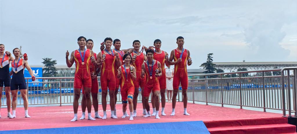 本网讯 近期,第31届世界大学生夏季运动会在成都举行。8月6日下午,在成都举行的第三十一届世界大学生夏季运动会赛艇项目中,我院2020级运动训练专业(现役运动员)学生苏雨恒与国家队队友团结拼搏以5分42秒27的成绩获得男子八人单桨有舵手决赛第三名,获得铜牌。继夏琦同学获得安徽首金后,胡凯同学获得两金一银,苏雨恒同学获得一铜,合师学子在本次大运会中取得了3金1银1铜1个第五名的历史最好成绩。