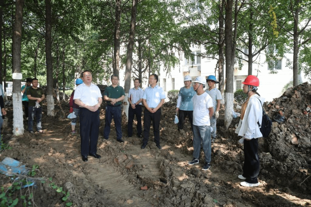 徐成钢一行先后来到锦绣校区管网改造施工、留学生公寓改造施工现场,听取了相关部门和施工单位关于工程建设情况的汇报,徐成钢深入工地、进楼房,并与施工人员亲切交谈,实地检查了施工进展、工程管理、工程质量及施工安全等工作情况。他对暑假期间工程改造项目给予了肯定,要求后勤处(基建办)、监理单位和各施工单位精心组织、规范施工,确保施工质量,按时完成暑期各项施工任务。要突出安全底线,确保安全施工。要强化责任担当,高标准、严要求,有力有序扎实推进维修改造工作顺利进行。