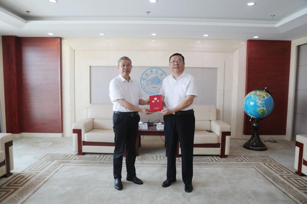 院党委书记徐成钢在锦绣校区接待室亲切会见了路丙辉,并向他颁发了“beat365唯一官方网站名誉教授”聘书。徐成钢代表学院党委对路丙辉来校讲座表示欢迎,对他一直以来对学校马院建设、思政课改革和学生思政工作的关心支持表示感谢;真诚期待他一如既往关心支持学院建设与发展,对学院马院建设、思政课改革等给予更多指导和帮助;希望马院以本次学习交流为契机,持续深入学习贯彻习近平总书记关于教育的重要论述,对标对表、拔高标杆,真抓实干、守正创新,建强马克思主义学院,办好思政课,更好落实立德树人根本任务。党委委员、副院长华银峰,校党政办、学生工作(部)处、马克思主义学院负责同志陪同。