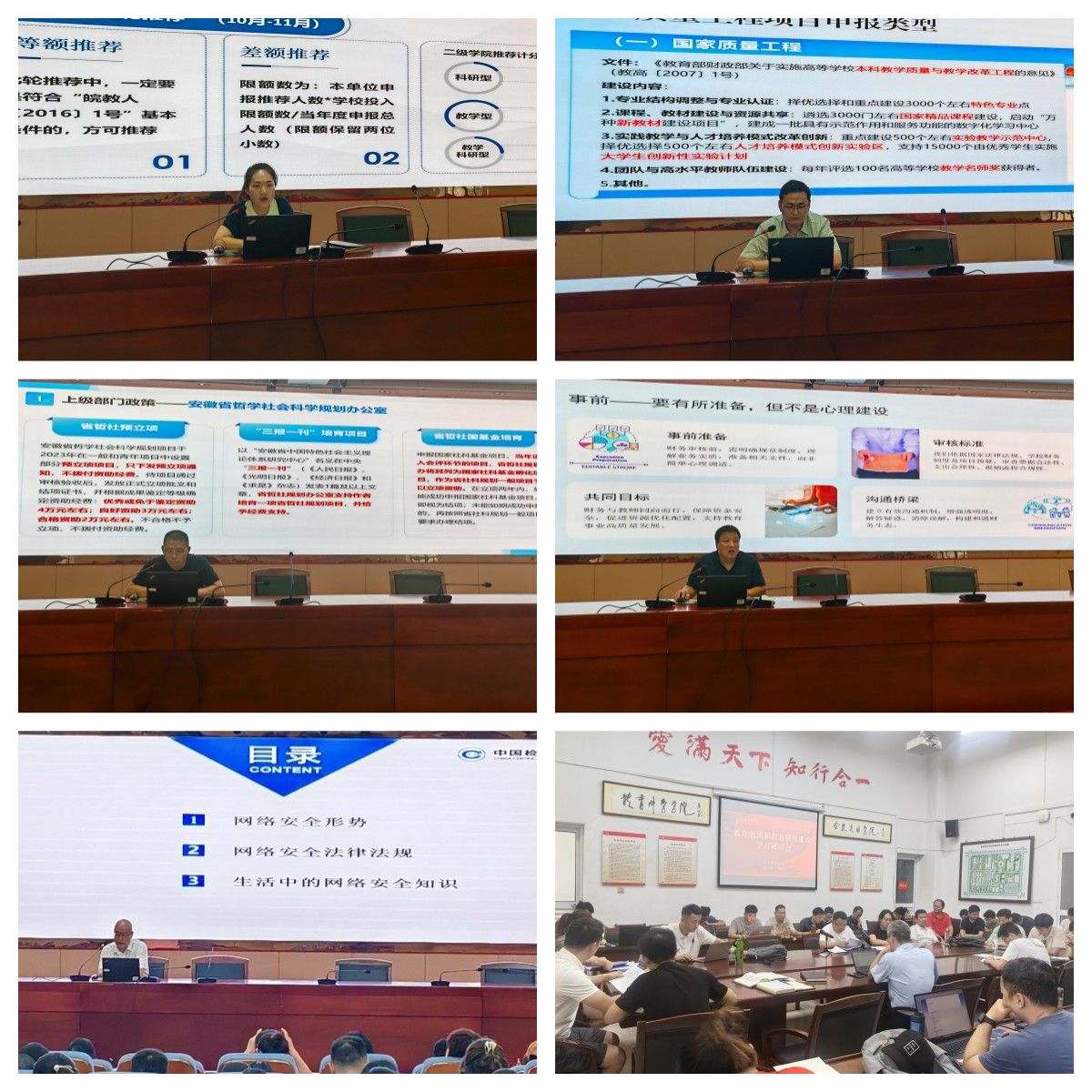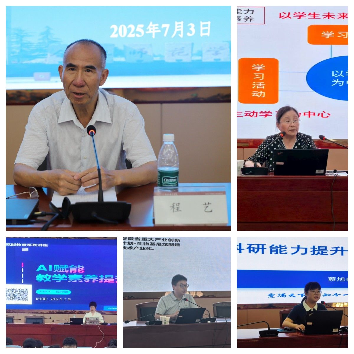 7月3日-9日,学院邀请了中国科学技术大学讲席教授、博士生导师程艺教授作《把握形势 找准方向 努力办好高等教育》专题报告,安徽农业大学教务处处长、材料与化学学院院长、博士生导师汪钟凯教授作《推动高校科技成果作价投资 助力高水平科技自立自强》专题报告,安徽大学教师发展中心原主任张洪教授作《创新教学设计 提升教学能力》专题报告。培训期间,还邀请了我校外国语学院钱莉娜副教授作《AI赋能教学素养提升》专题报告、生物与食品工程学院蔡旭冉副教授作《教师科研能力提升》专题报告,同时,信息化管理处、人事处、教务处、科研处、财务处等部门,结合服务教师工作实际,分别作了业务专题讲座。