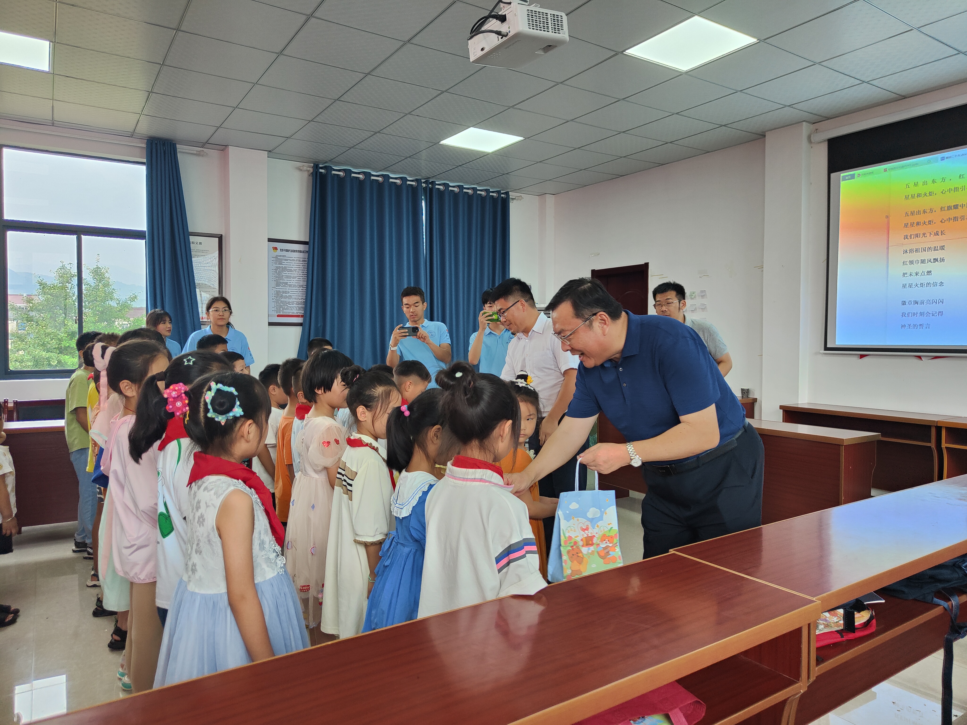 徐成钢先后走访了计算机与人工智能学院在青阳县杨田镇、庙前镇和贵池区孝肃社区等地开办的行知学堂,了解实践活动开展情况,为小学员们赠送学习用品,并与小学员一起,现场聆听“小先生”讲授的“学习党的二十大,争做新时代好少年”的思政课内容。调研中,徐成钢与“小先生”们亲切交谈,询问他们的实践活动开展情况和生活保障情况,充分肯定他们乐于奉献、躬身实践的志愿服务精神,希望“小先生”们认真学习贯彻习近平总书记关于青年工作的重要思想,秉持“爱满天下,知行合一”的校训精神,努力为城乡留守儿童营造积极向上、健康文明的学习环境,积极助力乡村振兴,让青春在奉献中焕发绚丽光彩。