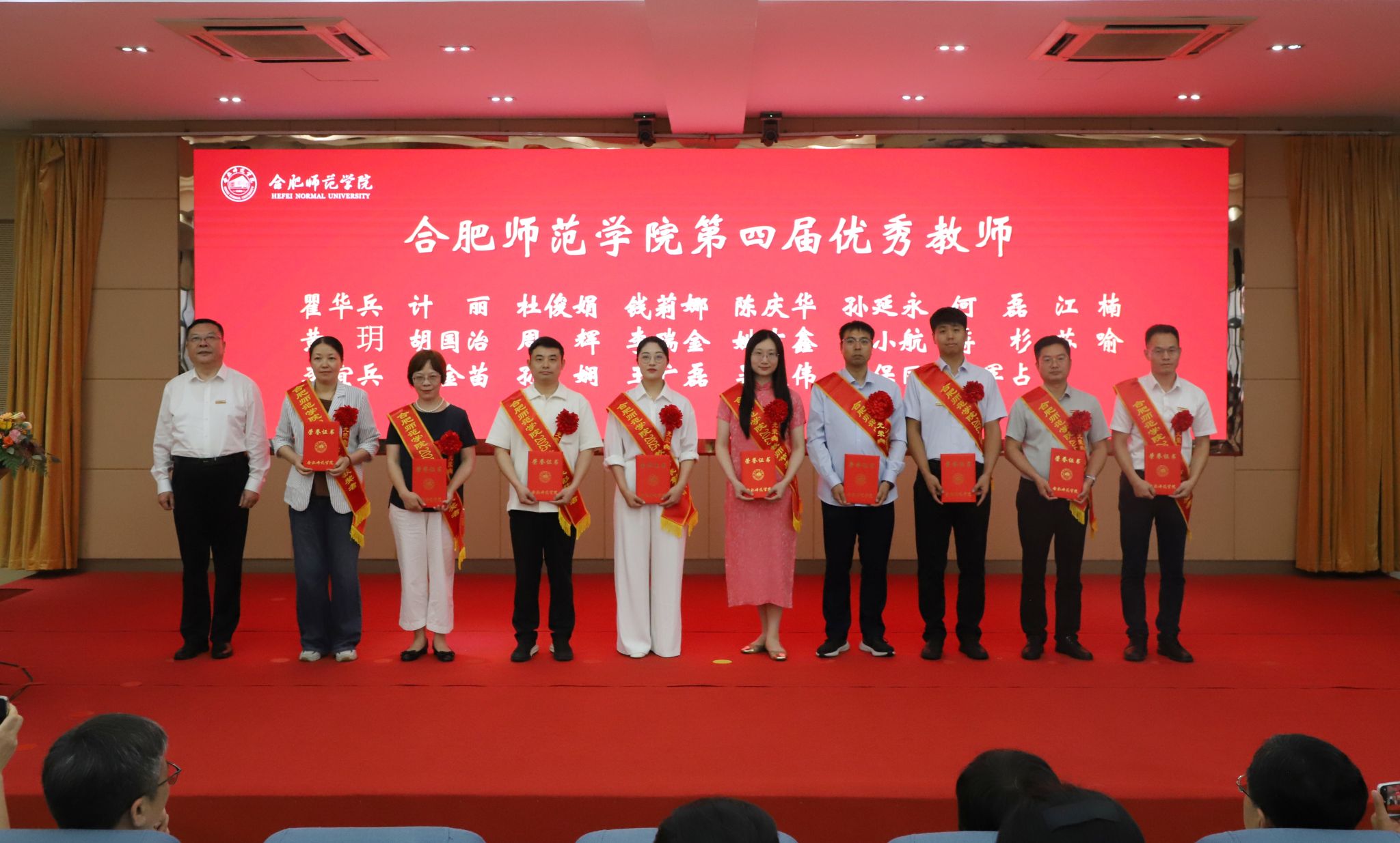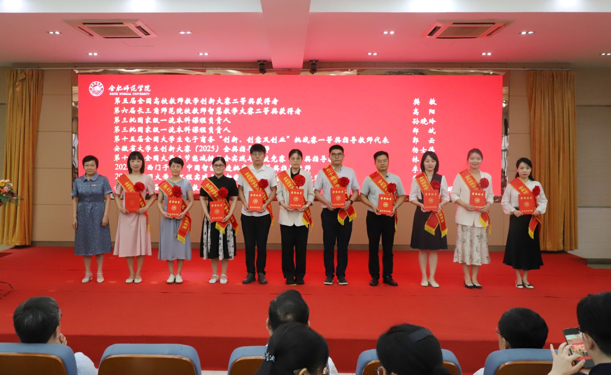 党委副书记梁立昌为全国高校教师教学创新大赛二等奖获得者,安徽省第七届高校青年教师教学竞赛一等奖、二等奖获得者等教师代表颁发荣誉证书