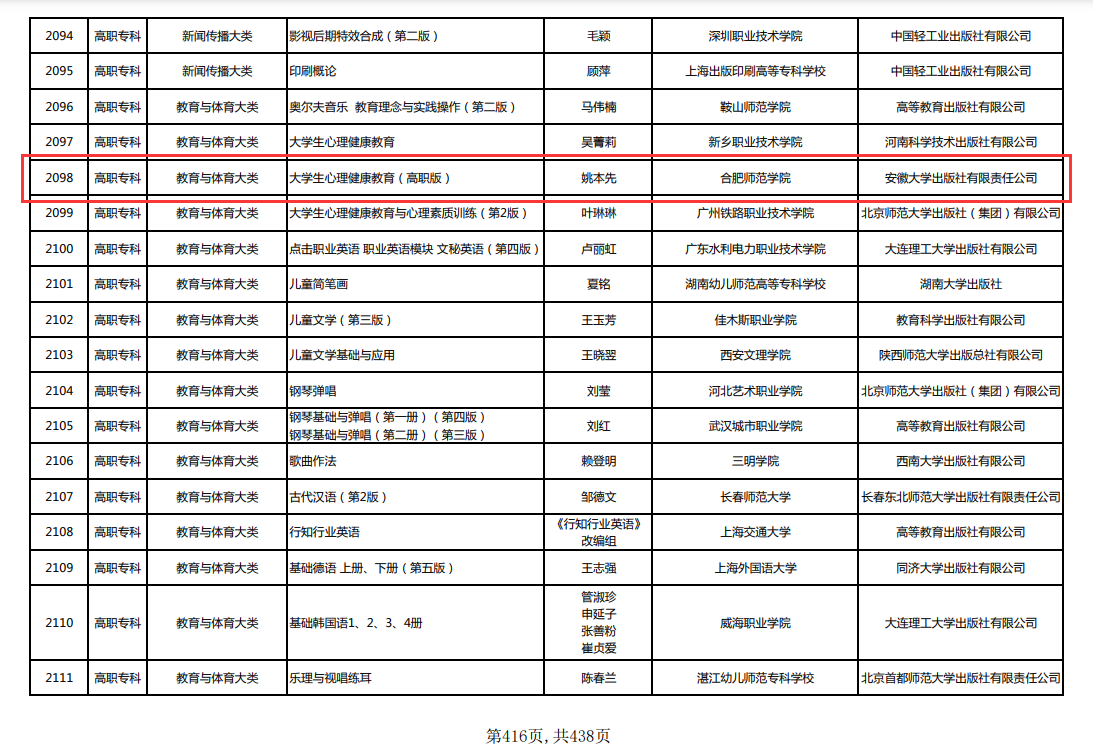 本网讯 近日,教育部公布了首批“十四五”职业教育国家规划教材名单,学院姚本先教授主编的教材《大学生心理健康教育(高职版)》入选。
