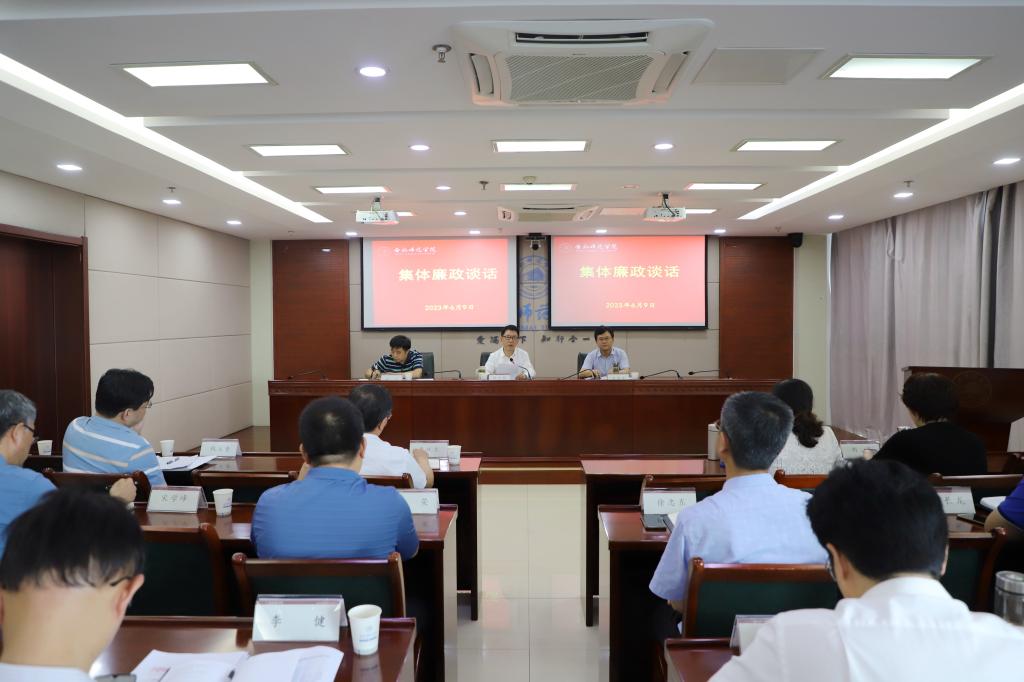 本网讯 6月9日下午,院纪委书记、监察专员徐文林与新提拔任用和交流任职的中层干部进行集体廉政谈话。院党委委员、组织部部长赵帮恚,纪委副书记、纪委办主任舒剑参加谈话。