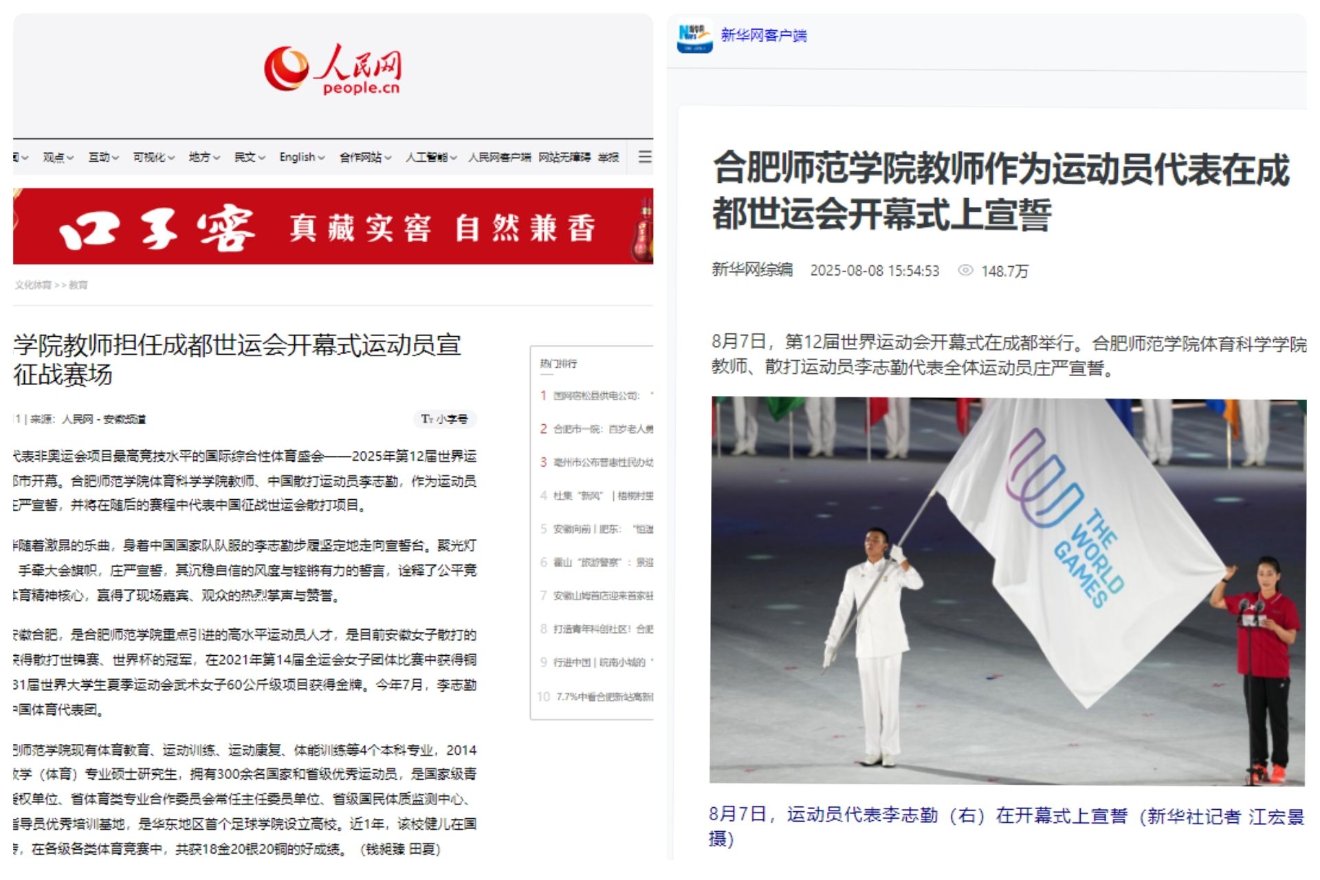 人民网、新华网等17家主流媒体报道我校体育科学学院教师李志勤在第十二届世界运动会开幕式上作为运动员代表庄严宣誓,并在女子散打60公斤级决赛中勇夺金牌