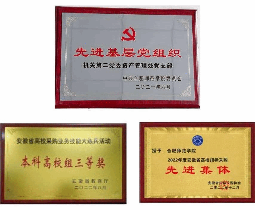 资产管理(招标办)工作的付出也赢得了同行们的高度评价和领导的肯定,先后获得了学院2021年度先进基层党组织、安徽省2022年度高校招标采购先进集体、安徽省2022年度高校采购业务技能大练兵活动本科组三等奖等多项荣誉。