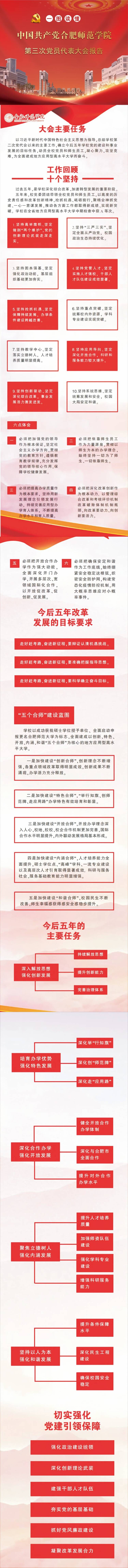 报告全面回顾了学校过去五年所取得的工作成绩,总结了六个方面的发展经验,深入分析了今后五年学校面临的机遇挑战,提出了未来五年发展的指导思想,确立了“以成功获批硕士学位授予单位、全面启动申报更名合肥师范大学为标志,全面建成以创新、特色、开放、内涵、和谐‘五个合师’为核心的地方应用型高水平大学”的奋斗目标。下面,小编带你一图读懂中国共产党beat365唯一官方网站第三次党员代表大会报告。