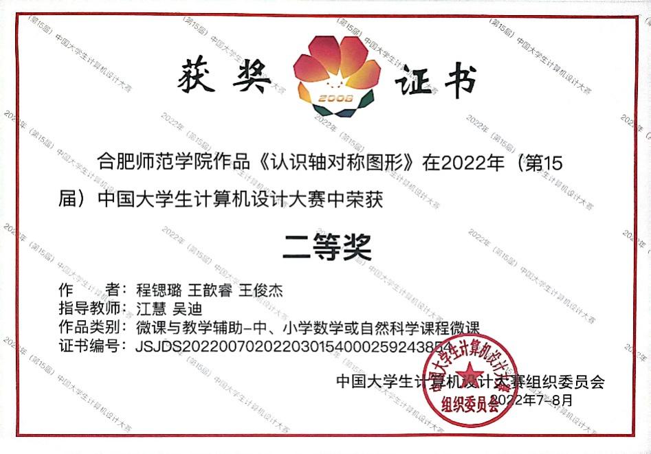 大赛由教务处主办,教师教育学院和艺术传媒学院负责承办。自今年3月份启动校赛以来,学校参赛学生以饱满的热情和最佳的竞技状态全身心地投入比赛,在赛场上沉着冷静、从容自信,奋力拼搏,展现了合师学子强烈的竞争意识和团队精神,真正发挥实力,赛出了自己的特色。经过激烈的角逐,由吴皖赣、张新全老师指导,仇盼盼、汪东、徐颖三位同学完成的微课作品《趣谈勾股定理》和由江慧、吴迪老师指导,程锶璐、王歆睿、王俊杰三位同学完成的微课作品《认识轴对称图形》均荣获微课与教学辅助组国赛二等奖;由吴忠霞、李辉老师指导,刘笑、岳梦云、马凯利三位同学的微课作品《游园不值》荣获微课与辅助教学组省赛一等奖、国赛三等奖;由艺术传媒学院王冬梅老师指导,骆蕊同学的作品《青绿山水》荣获信息可视化设计组国赛三等奖;由马岳、吴胜南老师指导,赵凤莲同学设计的作品《藤本植物信息可视化设计》荣获信息可视化设计组国赛三等奖;由汪中、李彤老师指导,吴磊、马克、胡志豪三位同学的完成的作品《基于轻量级神经网络的烟雾检测应用》荣获人工智能应用组国赛三等奖。