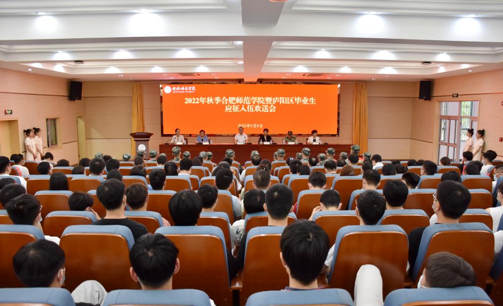 本网讯 携笔从戎书青春本色,建功军营圆强国梦想。9月8日下午,学院2022年秋季应征入伍毕业生欢送会在锦绣校区学术报告厅举行。院党委书记徐成钢,党委副书记、院长方东玲,庐阳区委常委、人武部政委刘泽生,庐阳区三孝口街道党(工)委书记桑田,学院征兵工作领导小组成员、二级学院党委副书记、2022届毕业生辅导员及2023届毕业生代表等参加会议。会议由党委副书记梁立昌主持。