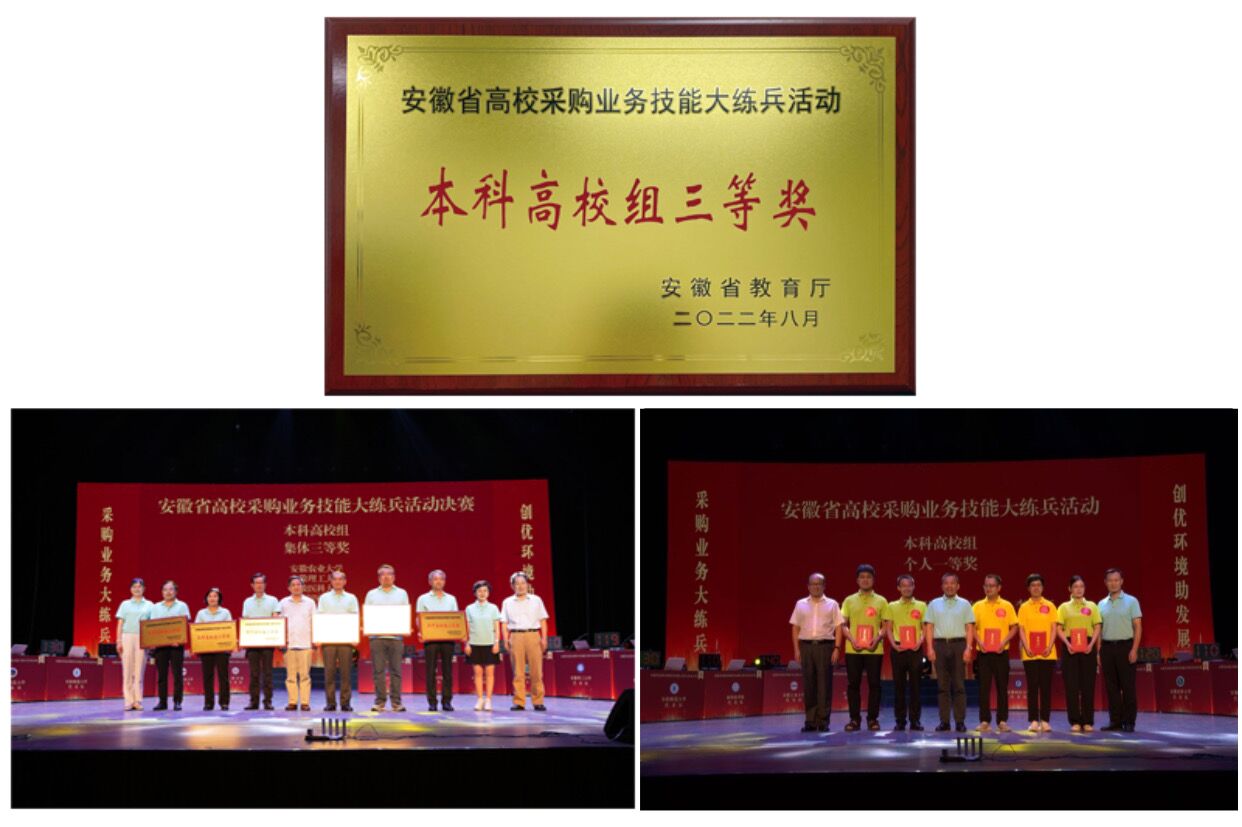 本网讯 8月28日下午,由安徽省教育厅主办,安徽艺术学院和安徽省招标采购协会承办,安徽省招标集团股份有限公司协办的安徽省高校采购业务技能大练兵活动决赛在合肥落下帷幕。比赛从预赛开始,成绩最好的12支代表队进入决赛。由宋学峰、吴科能、赵鹏翔组成的我院代表队发挥出色,获本科高校组团体三等奖,吴科能获个人一等奖。