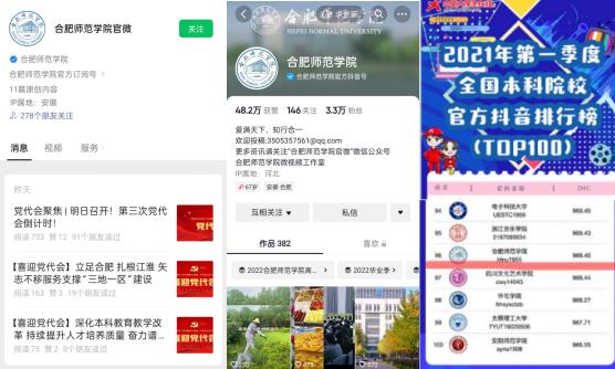 聚焦内涵建设,展好“合师形象”。集结校园全媒体中心力量,通过图解、音频、视频、H5等形式,生动鲜活创作表达,推出了如校庆65周年、世界冠军李慧茹专访、抗美援朝英雄专访等一系列优秀活动策划和传播作品。新媒体传播力不断提升,学院官方微信公众号关注用户数增加至3.1万余人,总阅读量80万,年平均发布微信600余篇。学院官方抖音账号自2019年12月开通以来,共发布短视频282条,粉丝量2.9万,点赞量43.2万,总计播放量超2779万人次。在2021年第一季度全国高校抖音综合影响力排行榜和全国高校抖音短视频传播力指数榜中位于全国高校排名第96位、安徽省排名第2位。