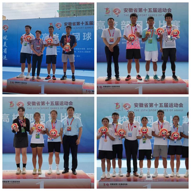 本网讯 7月18日-27日,由安徽省人民政府主办,省教育厅、省体育局、滁州市政府承办的安徽省第十五届运动会高校部网球比赛在天长中学举行。共有来自全省47所高校496名运动员参加3个组别(甲组、乙组、丙组)的男团、女团、男单、女单、男双、女双、混双共21个项目比赛。我院首次组队参加省运会高校部网球比赛,获得了丙组男女团亚军、男单亚军、女单季军、混双季军,女双第五名,甲组男单亚军,共斩获4银2铜,创造历史最好成绩。