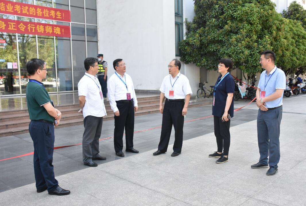 本网讯 6月18日至19日,2021年安徽省高校教师岗前培训结业考试(合肥考区)在我院锦绣校区逸夫楼举行,来自中国科学技术大学、合肥工业大学、安徽大学、安徽农业大学、安徽医科大学、安徽中医药大学、安徽建筑大学、合肥学院以及我院等九所高校的1521名考生参加考试。省委教育工委副书记、省教育厅厅长赵振华,省委教育工委副书记王佩刚,省教育厅人事处处长程宗林,副处长张艳艳,二级调研员童兆胜及省高师中心副主任张韬等来我院巡查指导考务工作。我院党委书记徐成钢,党委副书记、院长方东玲,副院长华银峰陪同巡查。