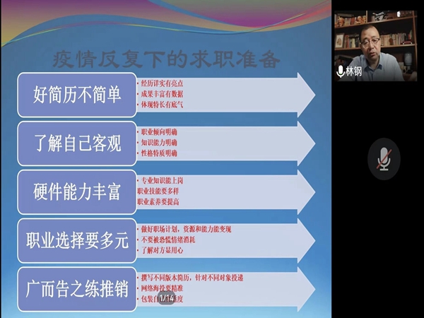 线上直播讲座由教育部首批万名创新创业导师、安徽省首批“筑梦”创业导师、安徽正德人力资源股份有限公司副总林钢担任主讲。林钢就目前国内疫情下的就业形势进行详细分析,罗列了当下毕业季的就业相关热门词汇,如“1076万”、“期望薪酬下降”、“考公、考研、考编”“灵活就业、自由职业”等,解释说明了这些热门词汇出现的背景与现实情况。他还从“好简历不简单”、“了解自己客观”、“硬件能力丰富”、“职业选择要多元”、“广而告之练推销”等五个方面为同学们梳理了当前疫情反复的情况下该如何做好求职准备,向同学们详细介绍了公务员、事业编、西部计划、特岗教师、“三支一扶”、社区专职工作岗位等不同就业途径,帮助毕业生拓宽就业求职眼界。最后,他就不断线就业服务与求职创业补贴政策,向同学们详细说明当前国家对大学生就业服务的强化与重视,以及大学生积极就业创业对于国家和社会的重要意义,引导同学们积极就业。同学们在线上踊跃提问,积极互动。