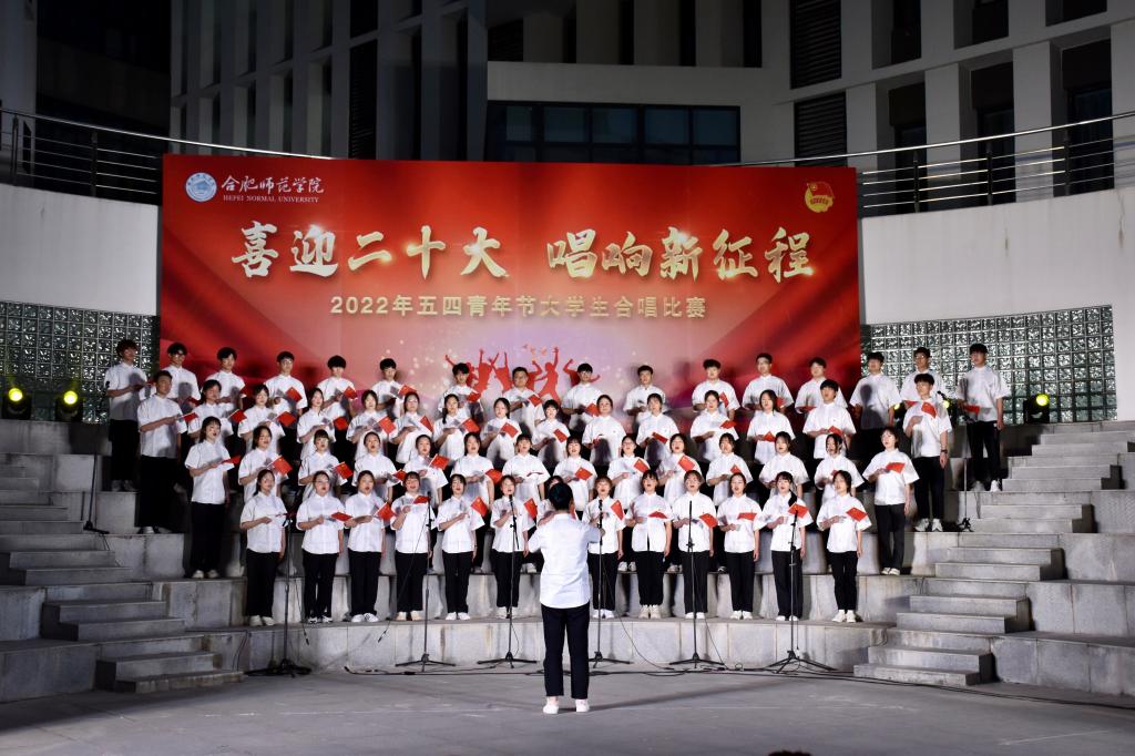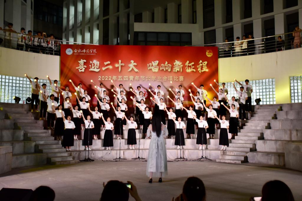 本网讯 为迎接党的二十大胜利召开,深入推进“喜迎二十大、永远跟党走、奋进新征程”主题教育实践活动,5月8日晚上,由院团委主办的“喜迎二十大 唱响新征程”五四大学生合唱比赛在滨湖校区举行。研究生处处长胡玉娟、院团委副书记刁文彬、外国语学院党委副书记马喆、马克思主义学院组织员束道锋,各二级学院团组织书记、各参赛学院指导老师及学生代表等400余人到场观看。音乐学院教师苏丽丽、谢梦珂、谭映、潘怡担任比赛评委。