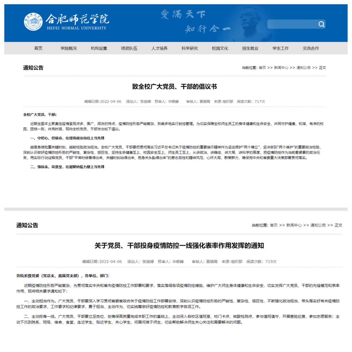 本网讯 “看到各位志愿者们,感觉很亲切,给人带来温暖和力量。”“有你们在,我们很安心。”院领导在走访调研师生全员核酸检测等疫情防控工作中,都对党员志愿者给予了充分肯定和高度评价。连日来,学院各级党组织和广大党员、干部牢记使命担当,扛起特殊责任,迅速集结、主动请战,成为战“疫”中的“先锋队”和“排头兵”,全力守护师生健康和校园安全。