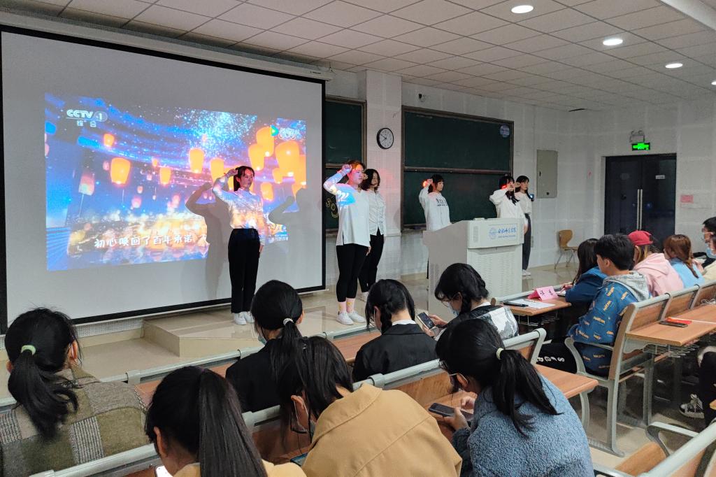 开幕式上,由青志联带来的手语操表演《万疆》,气势蓬勃的曲调配合明快律动的手语表达出青年学子对党、对祖国的崇敬与澎湃。而后开展的第一次教学活动中,青志联成员分列在讲台和两侧过道,细致讲解手语分解动作,全方位、多角度展示动作要领,耐心解答同学们的疑问,并热情邀请同学上台进行成果展示。在轻松愉悦的氛围中,同学们不仅学习到手语基本知识,切身体会聋哑人士的心理状态,也在悠扬的曲调中深入感受辉煌的红色文化。